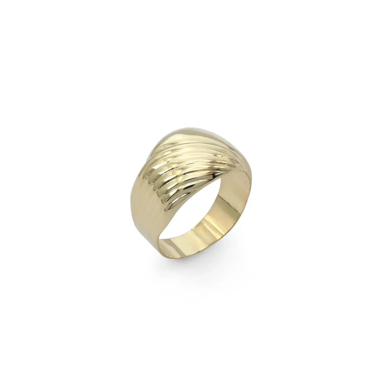 Ring aus 18-karätigem Gelbgold mit polierter Oberfläche. Der obere Teil ist zweigeteilt: Ein Abschnitt zeigt ein wellenförmiges Reliefmuster, während die andere Hälfte eine glatte, geradlinige Oberfläche aufweist. Dieses Spiel der Formen erzeugt einen modernen und eleganten asymmetrischen Kontrast. Die schräge Ringschiene sorgt für angenehmen und vielseitigen Tragekomfort.