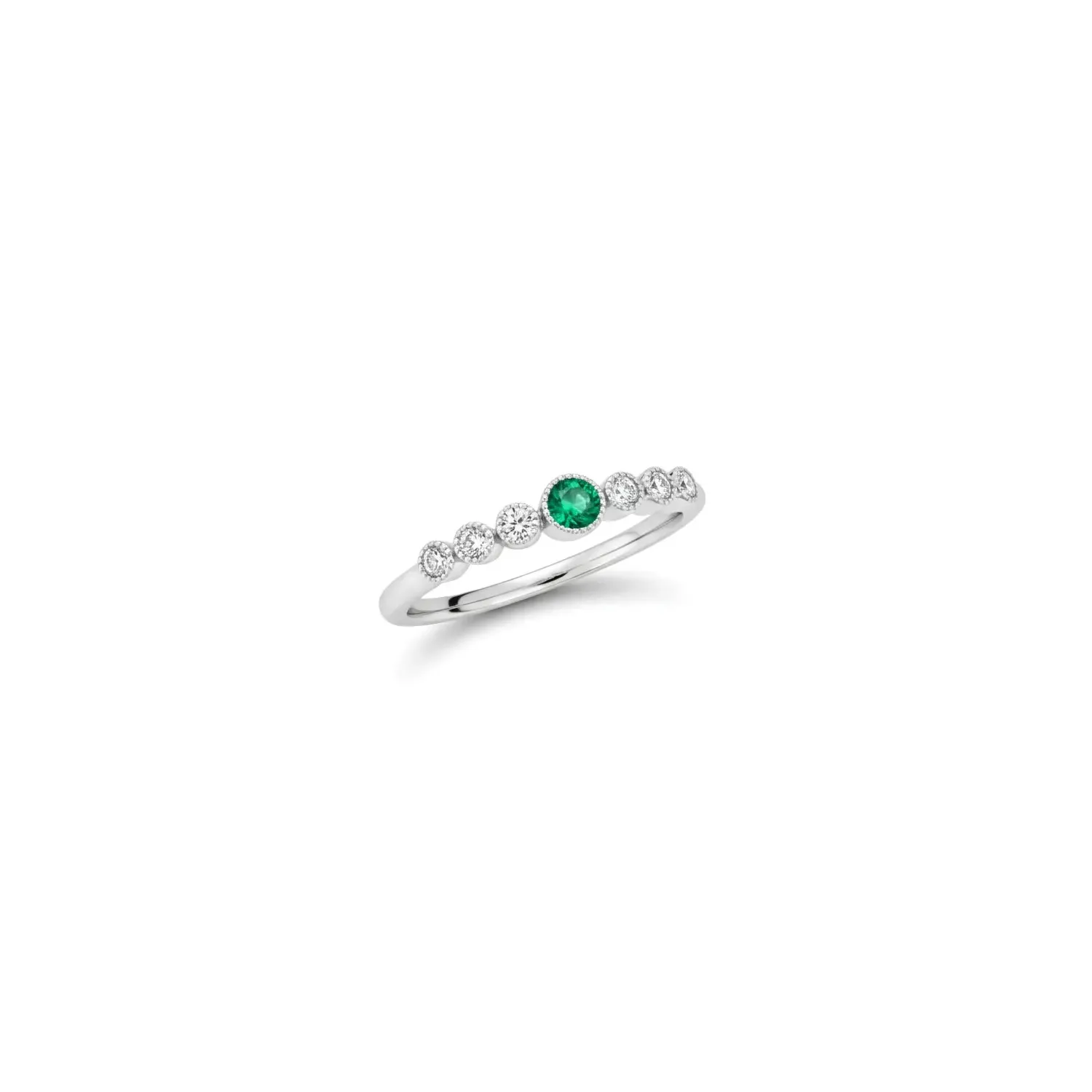 Dieser elegante Ring aus 18-karätigem Weißgold besticht durch sein dezentes und strahlendes Design. Im Zentrum prangt ein runder Smaragd von 0,06 ct, flankiert von einer Reihe brillantgeschliffener Diamanten mit einem Gesamtgewicht von 0,02 ct. Der Ring wiegt 1,50 Gramm und ist mit viel Liebe zum Detail gefertigt – ideal für alle, die ein kostbares und zugleich dezentes Schmuckstück suchen. Das Zusammenspiel des leuchtenden Grüns des Smaragds und der Brillanz der Diamanten macht diesen Ring zu einem zeitlosen Klassiker italienischer Goldschmiedekunst, der sich auch perfekt zum Kombinieren mit anderen Ringen eignet.