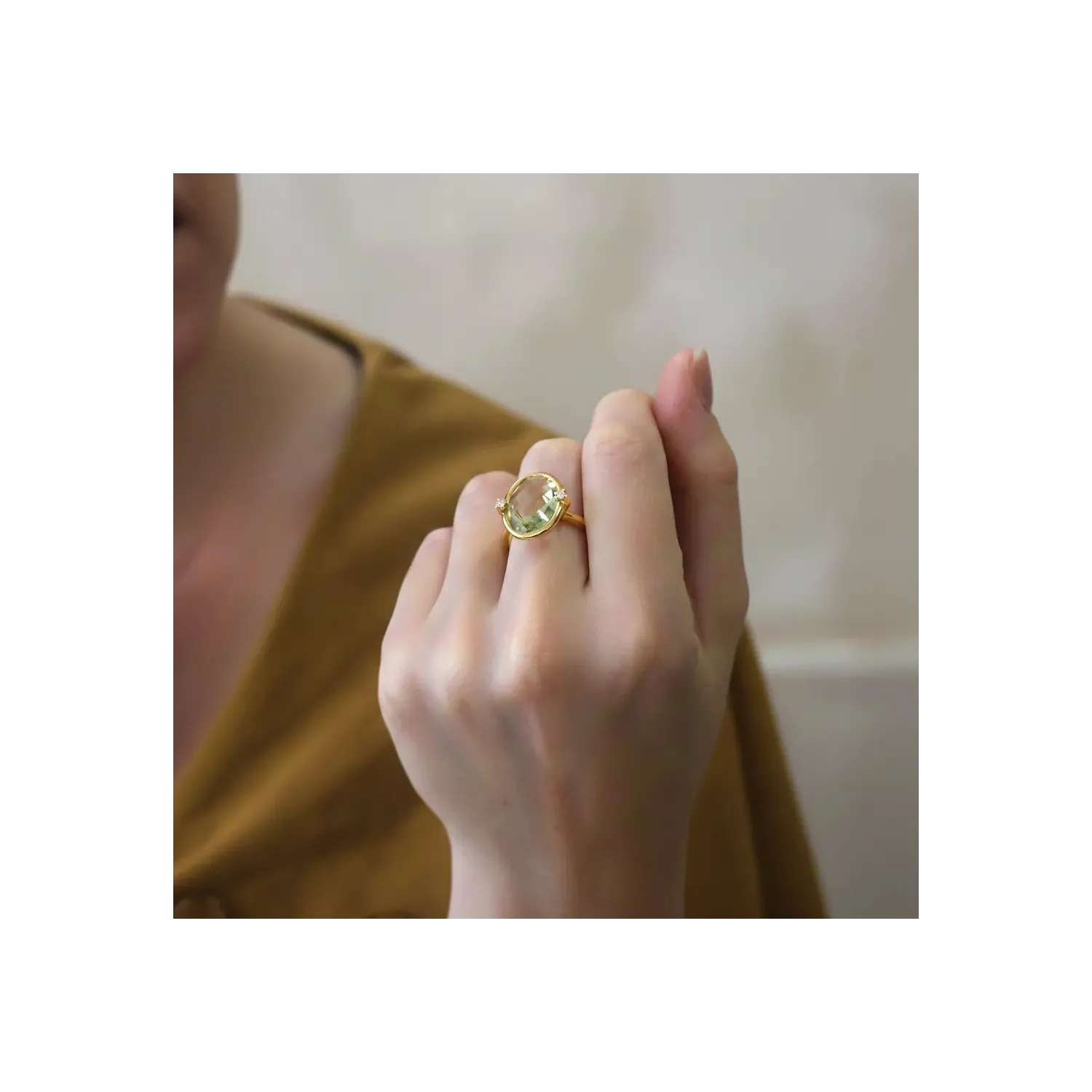 Ring aus 18-karätigem Gelbgold mit brillantgrünem Quarz und Diamanten