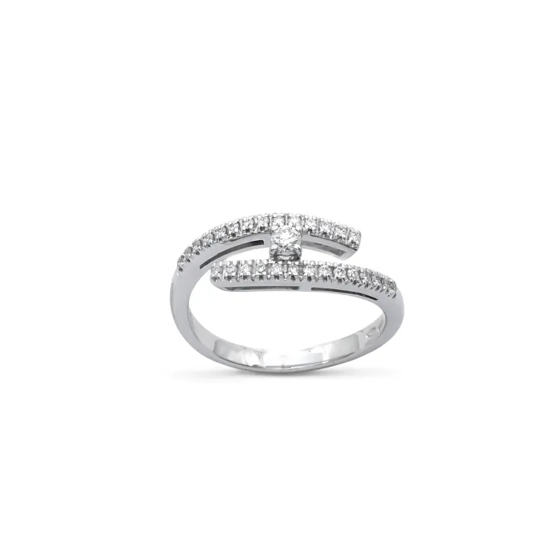 Dieser exklusive Ring aus 18-karätigem Weißgold verkörpert eine moderne Interpretation von Goldschmiedekunst. Das Design besticht durch ein paralleles, asymmetrisches Doppelband, das vollständig mit Pavé-gefassten Brillanten (insgesamt 0,30 ct) besetzt ist. Im Zentrum, zwischen den architektonischen Linien der Fassung schwebend, funkelt ein 0,10 ct schwerer Diamant und fängt das Licht aus jedem Winkel ein. Mit einem Gewicht von 4,20 Gramm bietet der Ring eine kraftvolle Präsenz und solide Struktur, ohne dabei an Leichtigkeit und Raffinesse einzubüßen. Die Präzision der Fassung und die Originalität der Formen machen ihn zu einem unverwechselbaren Beispiel italienischer Goldschmiedekunst.