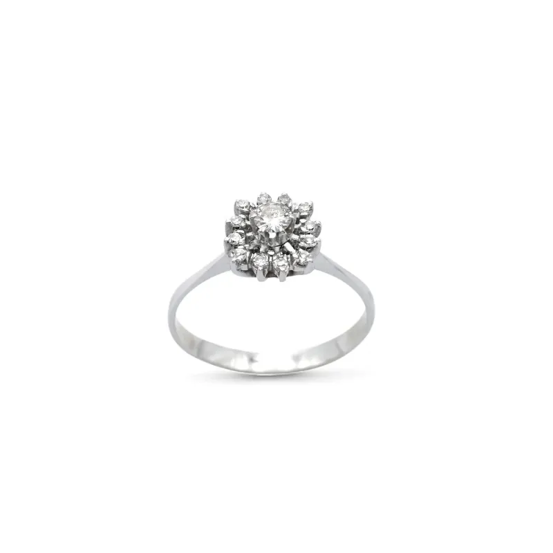 Dieser bezaubernde Rosettenring aus 18-karätigem Weißgold ist eine Hommage an florale Eleganz und ewiges Licht. Das Design entfaltet sich um einen kostbaren, 0,15 ct schweren Brillanten im Zentrum, der von einer Krone aus Diamanten (insgesamt 0,08 ct) umgeben ist. Diese verstärken seine Brillanz und erzeugen die Illusion einer einzigen, großen Lichtblüte. Der Ring wiegt 2,80 Gramm und besticht durch seine schlanke, elegante Ringschiene, die sich zum zentralen Rand hin verjüngt und die Komposition des Steins perfekt zur Geltung bringt. Die Meisterschaft italienischer Goldschmiedekunst spiegelt sich in der Präzision der Krappenfassung wider, die für sicheren Halt und maximale Lichtdurchlässigkeit sorgt.