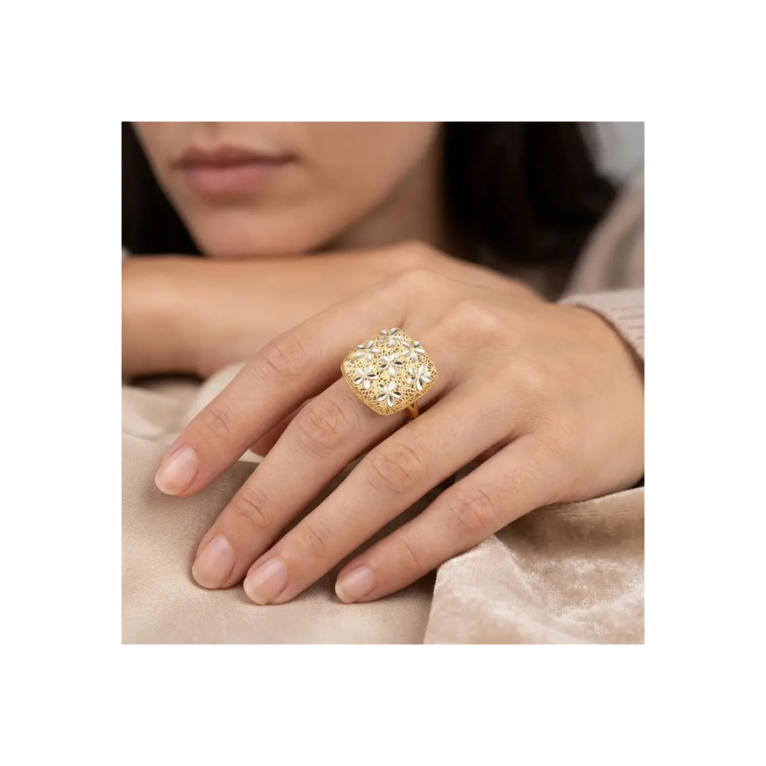 Ein tragbares Kunstwerk: Dieser Schildring aus 18-karätigem Gold bezaubert mit seiner außergewöhnlichen Handwerkskunst. Die majestätische quadratische Form ziert ein zartes wabenförmiges Design aus Gelbgold, verziert mit leuchtenden Weißgold-Einsätzen in Form von Blütenblättern und Blumen, die meisterhaft diamantgeschliffen sind und jedes Lichtstrahl reflektieren. Mit einem Gewicht von 4,80 Gramm vereint der Ring eindrucksvolles Volumen mit überraschender Leichtigkeit. Die zweifarbige Oberfläche und die gestickte Textur machen ihn zu einem Schmuckstück von seltener Raffinesse – ideal für alle, die ein ausdrucksstarkes Accessoire aus italienischer Fertigung suchen, das zeitlose Eleganz verkörpert.