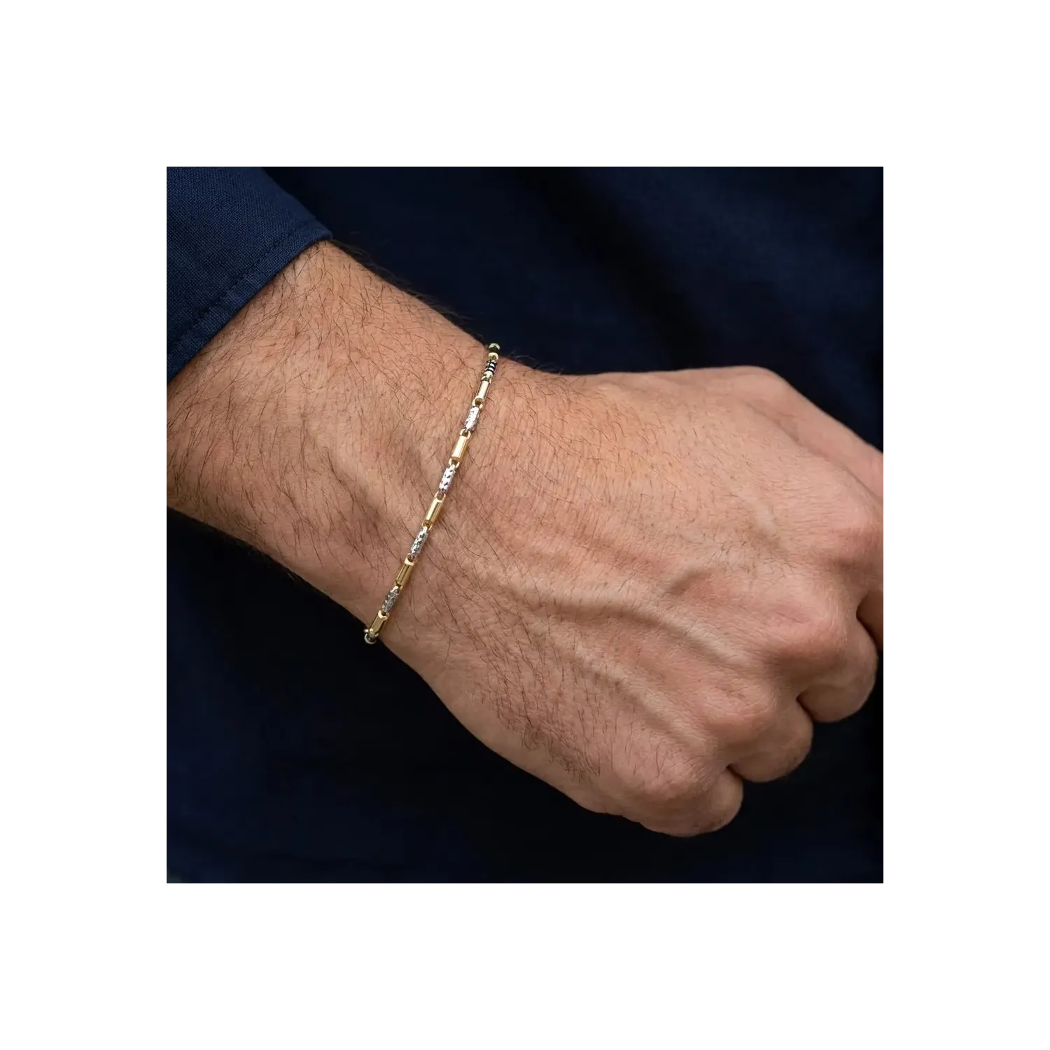 Zweifarbiges Armband aus 18-karätigem Gold, 21 cm lang. Das Design besticht durch den rhythmischen Wechsel von Gelbgold- und Weißgoldelementen, der einen markanten und modernen Farbkontrast erzeugt und den Glanz des Armbands unterstreicht. Das Armband ist robust und flexibel zugleich und bietet so einen angenehmen Tragekomfort für Herrenhandgelenke oder ist auch für Frauen geeignet, die ein ausdrucksstärkeres, feminines Schmuckstück bevorzugen. Ein vielseitiges Accessoire in höchster italienischer Goldschmiedekunst, das jedem Outfit einen Hauch von zweifarbiger Eleganz verleiht.
