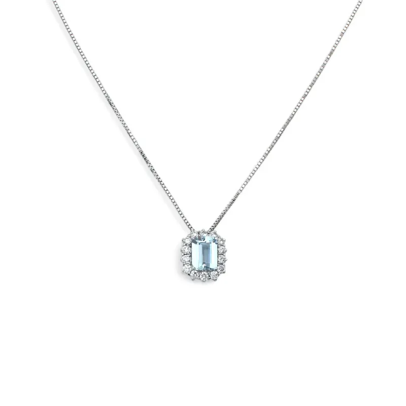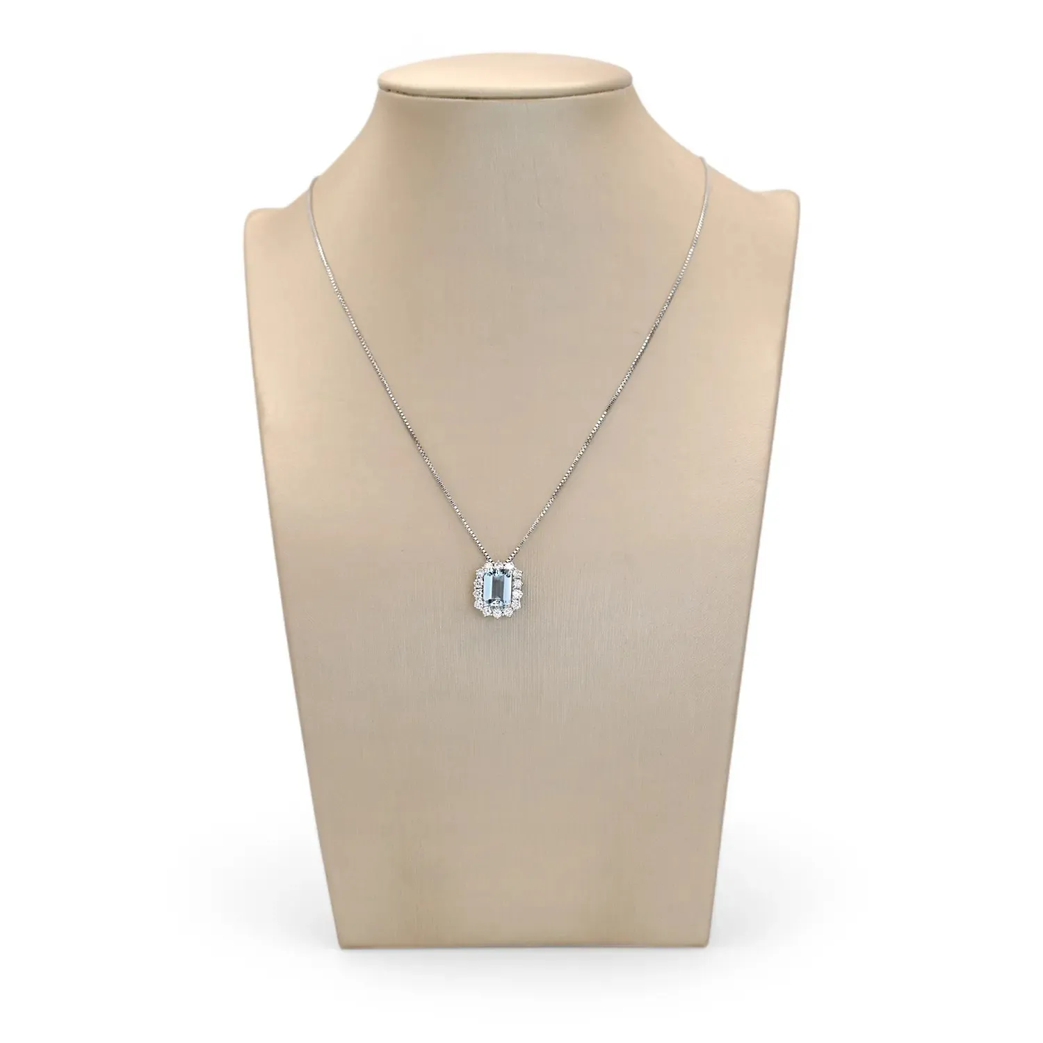 Atemberaubende Halskette von Stella Maris mit einem zarten Aquamarin im Achteckschliff von 1,31 Karat, umgeben von leuchtenden Diamanten im Brillantschliff mit insgesamt 0,54 Karat. Diese Halskette ist aus hochwertigen Materialien gefertigt und wiegt 4,90 Gramm. Sie ist eine elegante und edle Ergänzung für jede Sammlung.