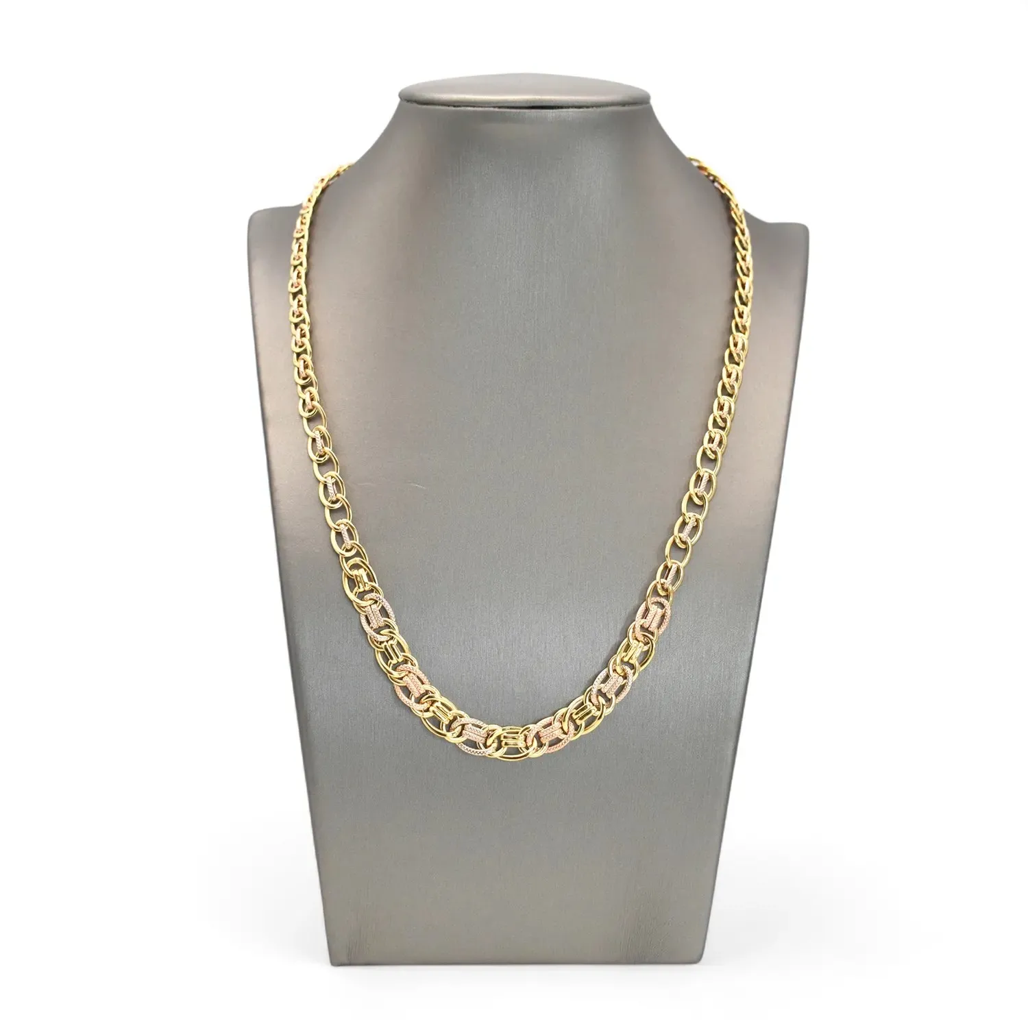 Elegante Halskette aus 18-karätigem Gelbgold, verziert mit dekorativen Elementen aus 18-karätigem Roségold und Weißgold. Jedes Element ist mit einem gerändelten Muster mit erhabenen Streifen versehen, wodurch ein raffiniertes Spiel von Licht und Volumen entsteht. Das abwechselnde Design der drei Goldfarben macht das Schmuckstück vielseitig und unverwechselbar. Die Halskette wird durch einen funktionalen und robusten Sicherheitsverschluss abgerundet. Ein Klassiker italienischer Goldschmiedekunst, modern interpretiert.