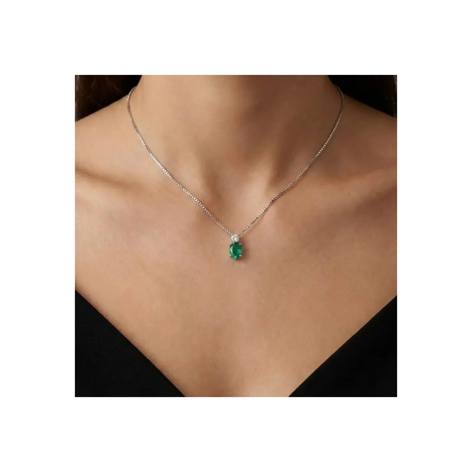 Diese elegante Halskette aus 18-karätigem Weißgold besticht durch einen Anhänger in klassischem Design. Im Zentrum steht ein ovaler Smaragd von 0,05 ct, der von einem Brillanten von 0,01 ct als kostbarem Glanzstück gekrönt wird. Der Anhänger ist an einer zarten und robusten venezianischen Choker-Kette befestigt, die seine Brillanz unterstreicht und für einen perfekten Sitz sorgt. Ein zartes und zeitloses Schmuckstück, ideal für alle, die die Intensität des Smaragdgrüns in Kombination mit der Reinheit von Weißgold lieben. Handwerkliche Exzellenz – Made in Italy.