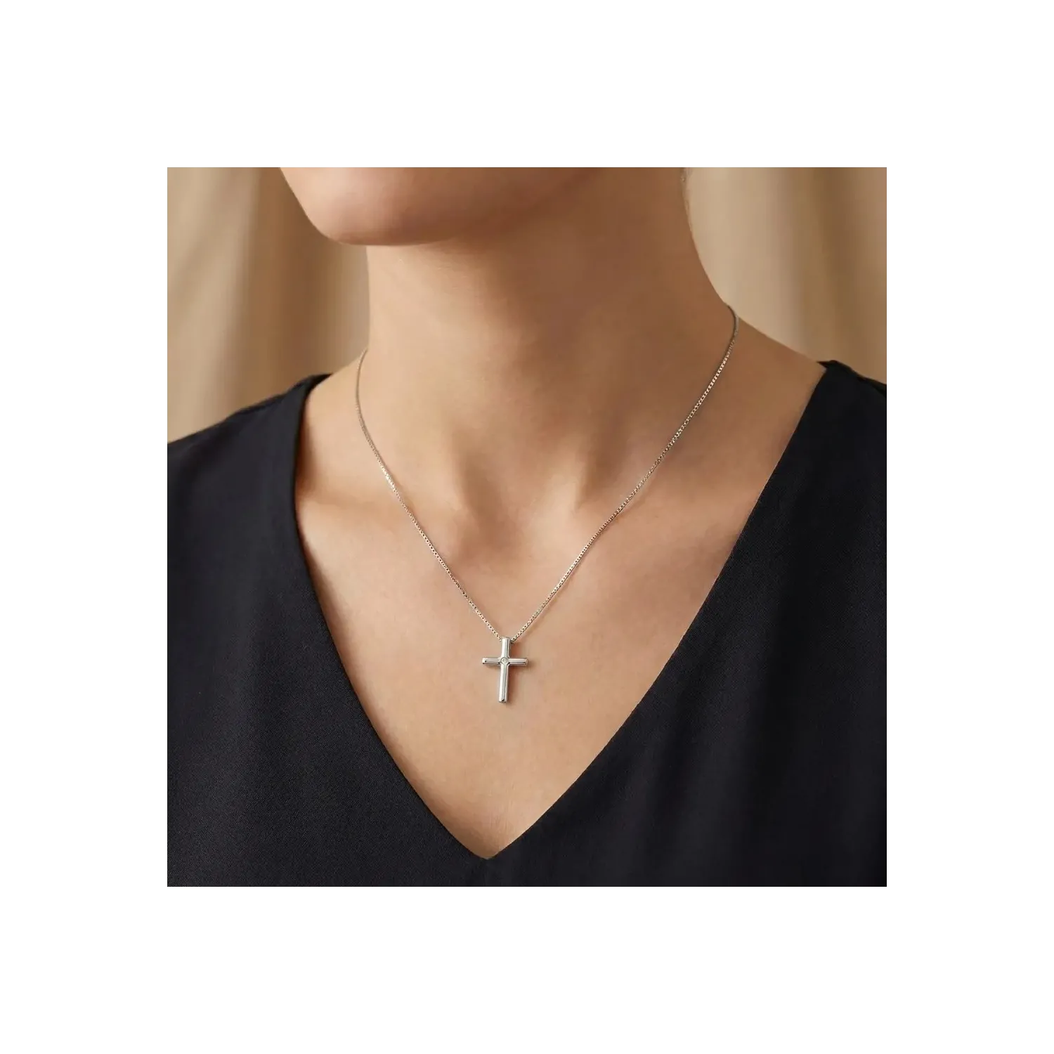 Diese elegante Halskette aus 18-karätigem Weißgold besticht durch ihr klassisches und raffiniertes Design und ist ein symbolträchtiges und zeitloses Schmuckstück. Der kreuzförmige Anhänger mit seinen klaren, modernen Linien trägt einen 0,01 ct großen Brillanten in der Mitte, der einen dezenten und kostbaren Akzent setzt. Die Halskette ist mit einer 40 cm langen Kette im venezianischen Stil ausgestattet, die für ihre einzigartigen quadratischen Glieder bekannt ist und so für Langlebigkeit und dauerhaften Glanz sorgt. Mit einem Gesamtgewicht von 2,60 Gramm verkörpert diese Halskette die höchste italienische Handwerkskunst und ist perfekt, um besondere Anlässe mit schlichter Eleganz zu feiern.