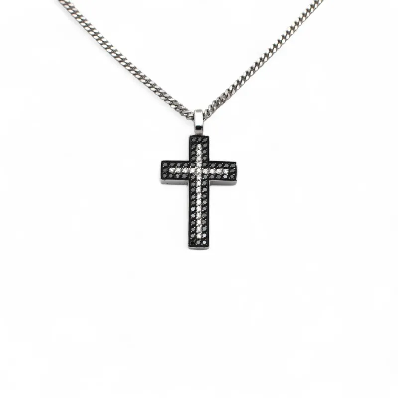 Unisex-Halskette aus 18-karätigem Weißgold mit Groumette-Kette und Kreuz mit weißen und schwarzen Diamanten