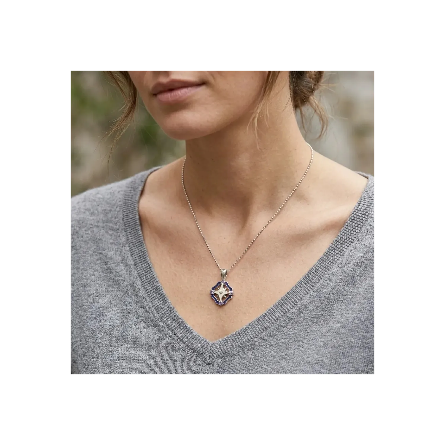 Der Anhänger ist mit einem raffinierten Spiel von Farbkontrasten verziert, das durch die Verwendung von blauer und weißer Emaille entsteht. Diese Emaille definiert die Himmelsrichtungen und den zentralen Stern. Im Zentrum der Komposition funkelt ein 0,01 ct schwerer Brillant, der einen dezenten, aber kostbaren Akzent setzt. Die Halskette besticht durch ihr modernes Design mit maritimen Anklängen und ist, gefertigt in Italien, das ideale Accessoire für Damen und Herren.