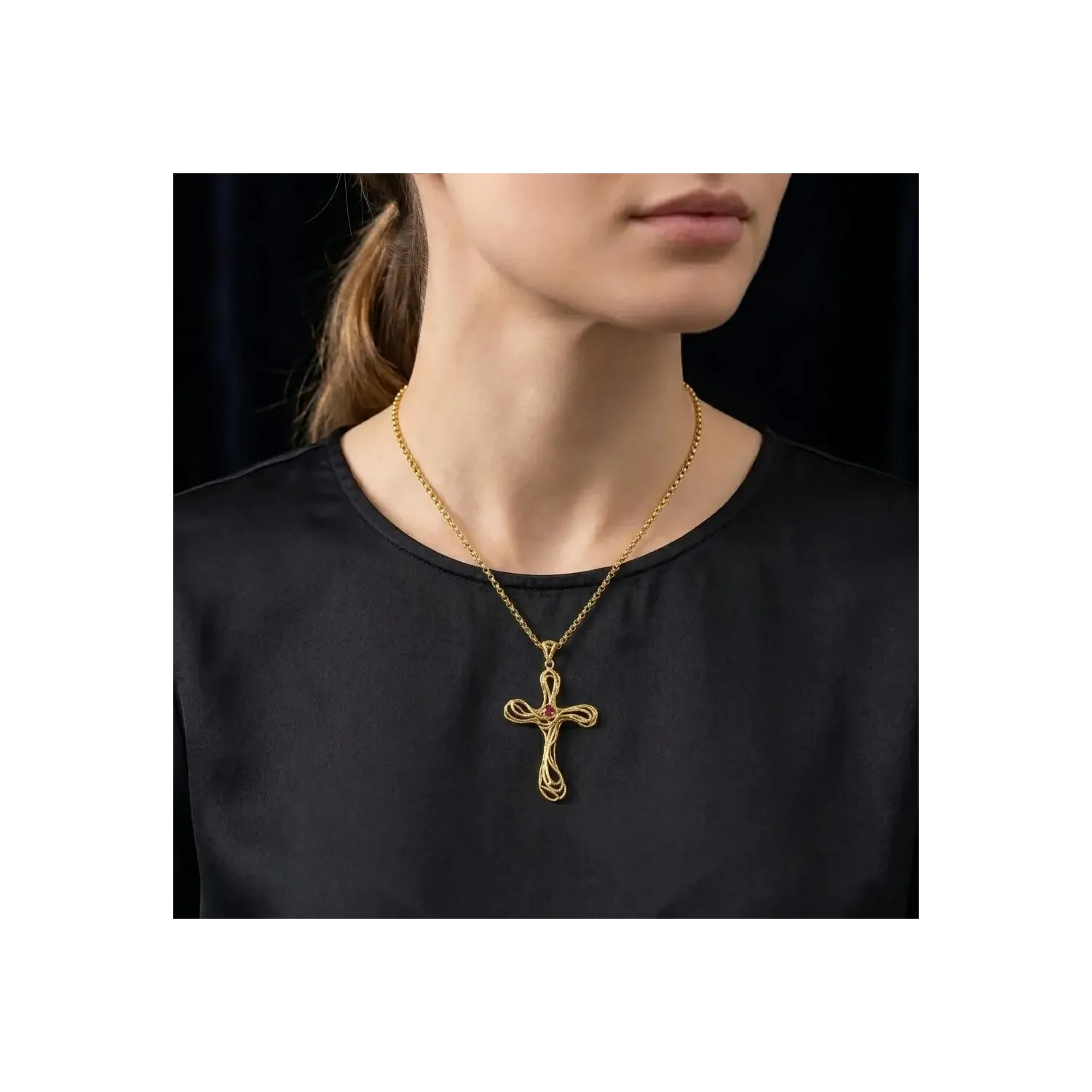 Diese majestätische Halskette aus 18-karätigem Gelbgold ist ein Schmuckstück von seltener Schönheit, das spirituelle Symbolik und feinste Goldschmiedekunst vereint. Die massive, klassische Rolokette trägt ein imposantes, 6,5 cm langes, kunstvoll gearbeitetes Kreuz. Das Design des Anhängers besticht durch seine filigrane Durchbrucharbeit und die fein ziselierten Details, die dem Schmuckstück eine skulpturale Tiefe und zeitlose Eleganz verleihen. Im Zentrum des Kreuzes befindet sich ein runder Rubin von 0,12 ct, dessen intensives Rot einen königlichen Kontrast zum warmen Gelbgoldton bildet. Mit einer Gesamtlänge von 48 cm setzt die Halskette ein ausdrucksstarkes und strahlendes Statement am Dekolleté. Ein Juwel italienischer Handwerkskunst par excellence.