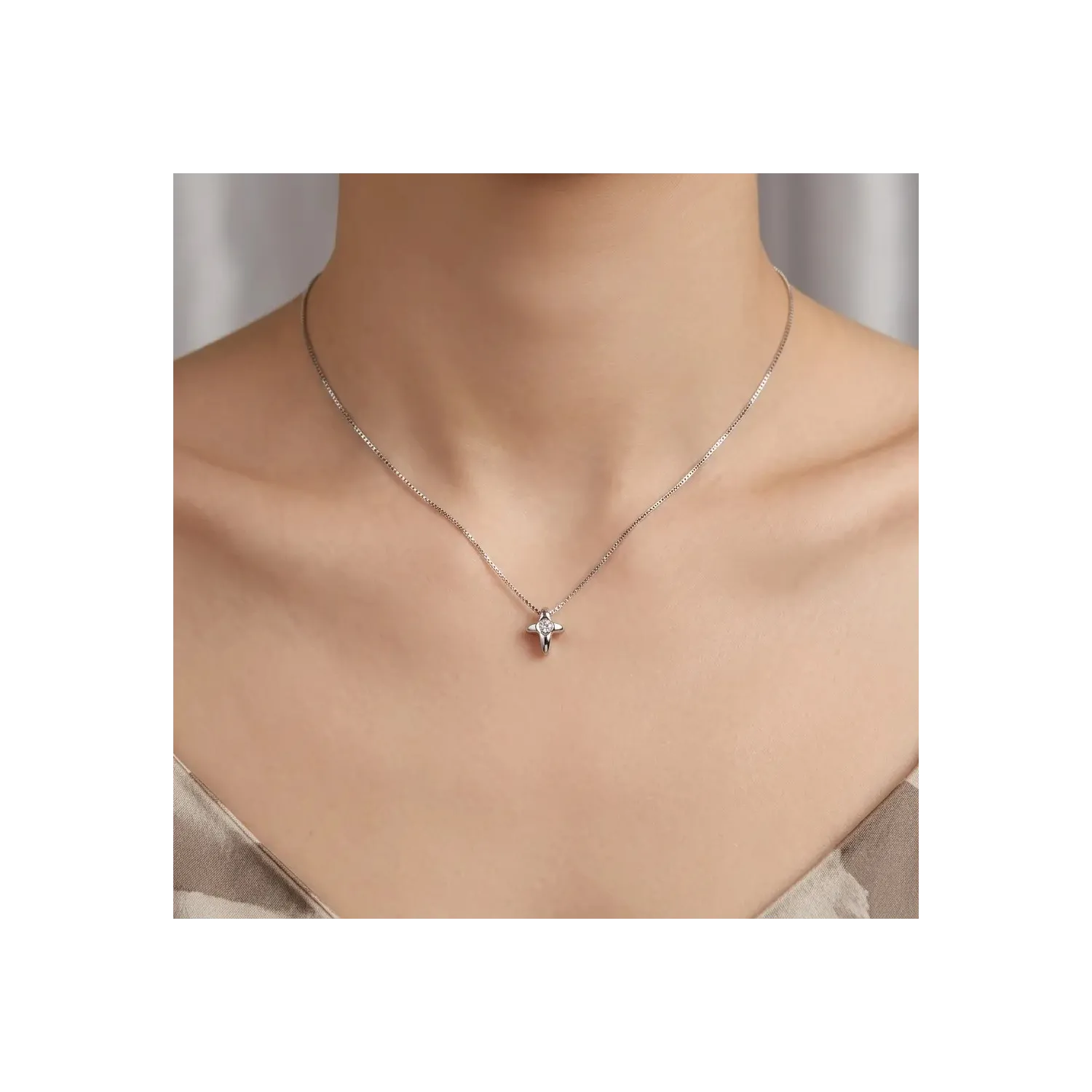 Diese zarte Halskette aus 18-karätigem Weißgold vereint schlichte Eleganz mit Leichtigkeit. Das Design besticht durch ein kleines, gewölbtes Kreuz mit weichen, fließenden Linien, das der Halskette eine moderne, dreidimensionale Optik verleiht. Im Zentrum des Kreuzes befindet sich ein 0,02 ct schwerer Brillant, der trotz seiner dezenten Größe ein lebendiges Funkeln entfaltet.