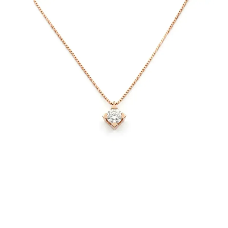 Der Kontrast zwischen der kühlen Brillanz des Diamanten und der romantischen Wärme des Roségolds verleiht dem Schmuckstück einen modernen und eleganten Charakter. Die klassische venezianische Kette aus passendem Gold sorgt für einen perfekten Sitz am Dekolleté und bietet hohen Tragekomfort und Langlebigkeit. Ein Meisterwerk italienischer Goldschmiedekunst.