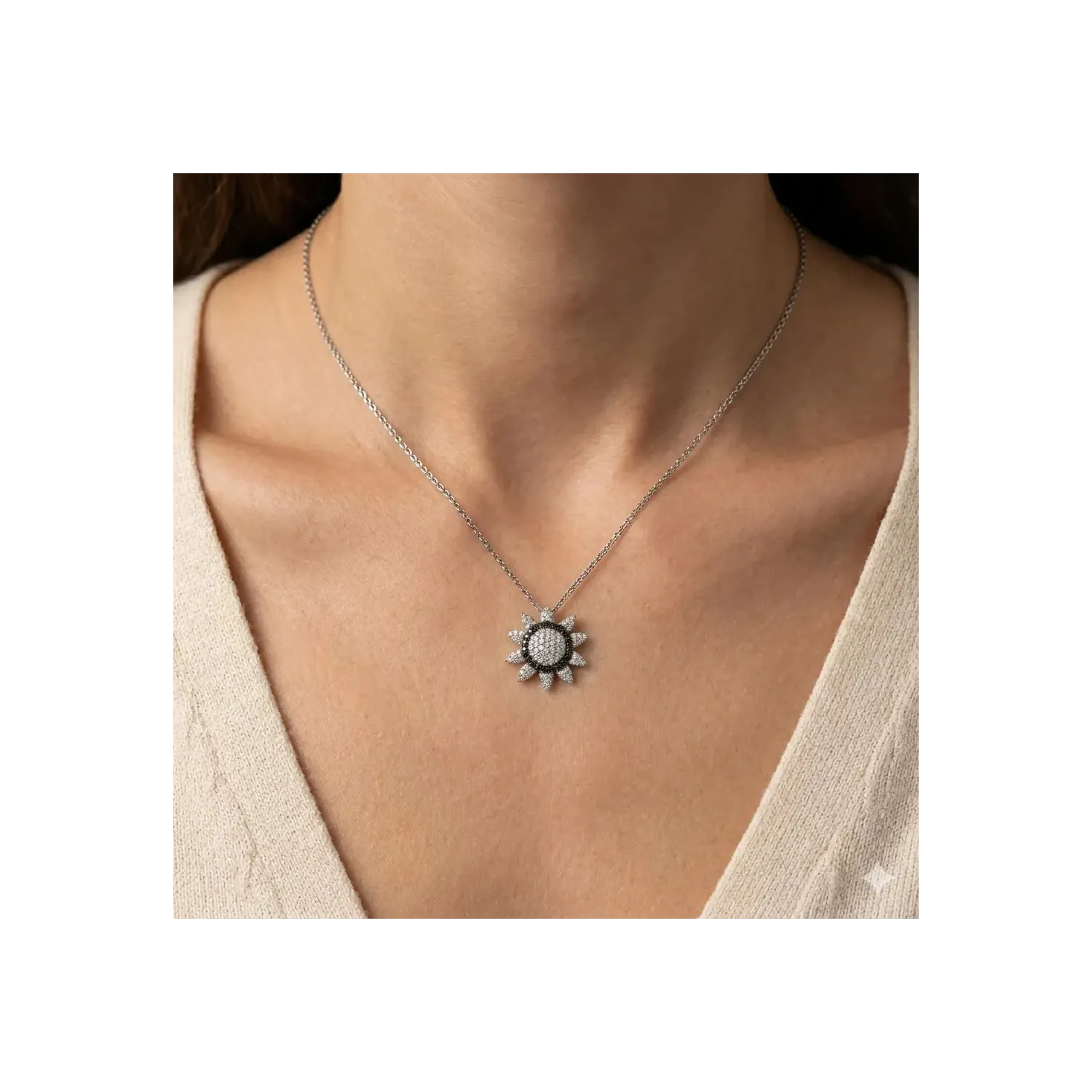 Halskette mit Sonnenanhänger aus 18-karätigem Weißgold, besetzt mit weißen und schwarzen Diamanten
