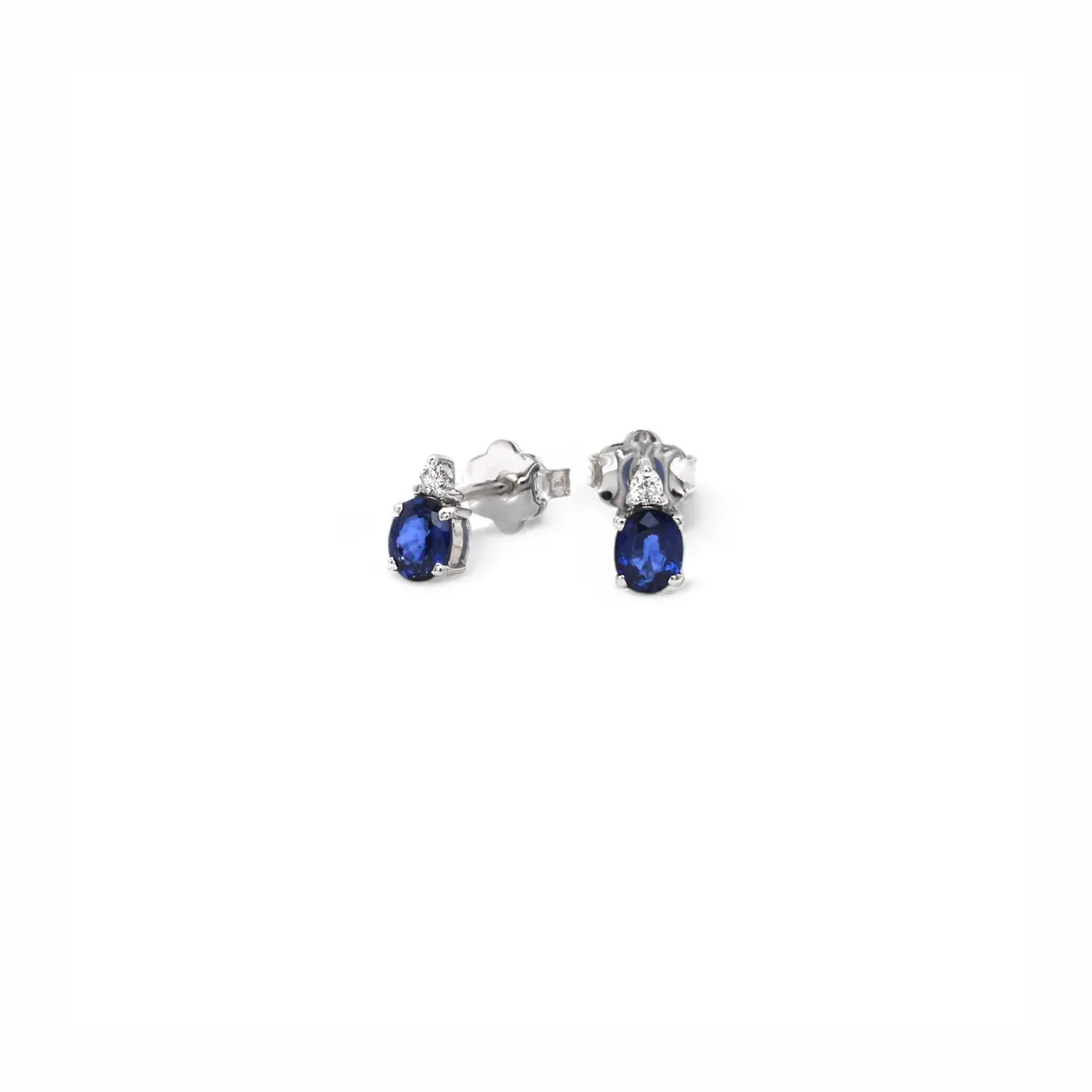 Diese eleganten Ohrstecker aus 18-karätigem Weißgold präsentieren zwei ovale Saphire mit einem Gesamtkaratgewicht von 0,82 ct. Das Design wird durch brillantgeschliffene Diamanten (Gesamtkaratgewicht 0,06 ct), Farbe G, Reinheit VS, verziert, die als elegante Akzente über den Hauptsteinen gesetzt sind. Mit einem Gewicht von 1,6 Gramm vereint dieses Schmuckstück Leichtigkeit und klassische Ästhetik. Die Krappenfassung sorgt für maximale Brillanz der Steine und verstärkt den Kontrast zwischen dem Weißgold und dem intensiven Blau des Saphirs. Ein diskretes und kostbares Stück italienischer Haute Joaillerie.