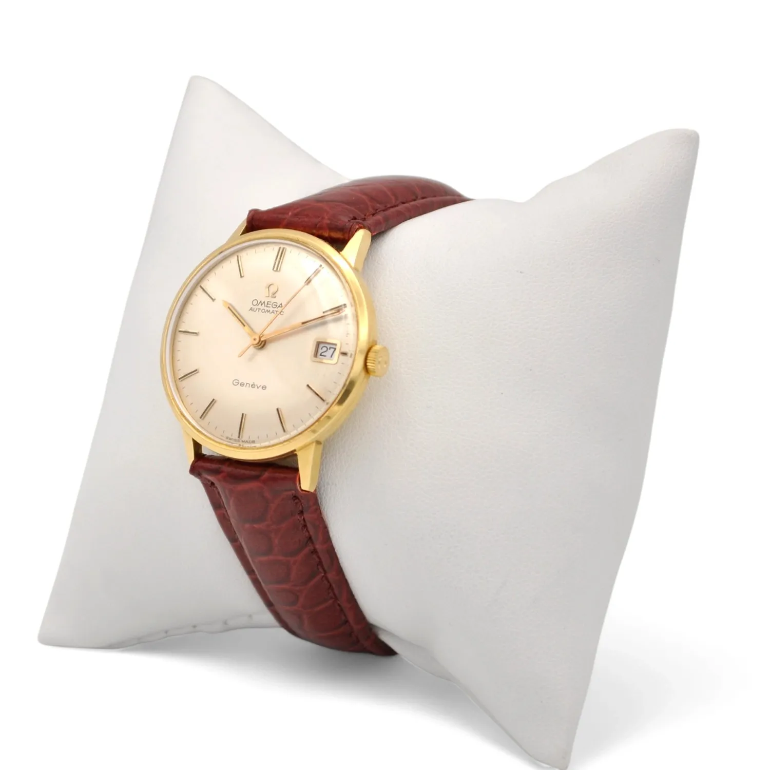 Elegante Vintage-Armbanduhr von Omega aus Gelbgold, ein wahres Juwel der Schweizer Uhrmacherkunst. Das weiße Zifferblatt mit Stabindexen und Datumsfenster ist in perfektem Zustand. Das Gelbgoldgehäuse mit seinen klaren Linien verleiht der Uhr eine zeitlose Eleganz. Das mechanische Uhrwerk mit Automatikaufzug aus dem Hause Omega garantiert Präzision und Zuverlässigkeit. Ein braunes Lederarmband vervollständigt die klassische Ästhetik dieser Uhr. Ein einzigartiges Sammlerstück, perfekt für alle, die eine Uhr von sehr hoher Qualität suchen.