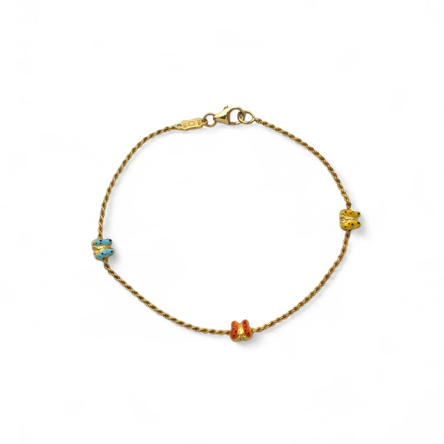 This 18kt Yellow Gold Bracelet is a delicate and colorful jewel that captures the elegance and lightness of butterflies. The fine rope link chain is interspersed with small butterfly-shaped elements enameled in bright colors (red/orange, yellow, blue), giving a touch of freshness and playfulness. Measuring 18 cm and weighing 3 g, it is a lightweight and versatile accessory, ideal for an everyday look or as a thoughtful gift.