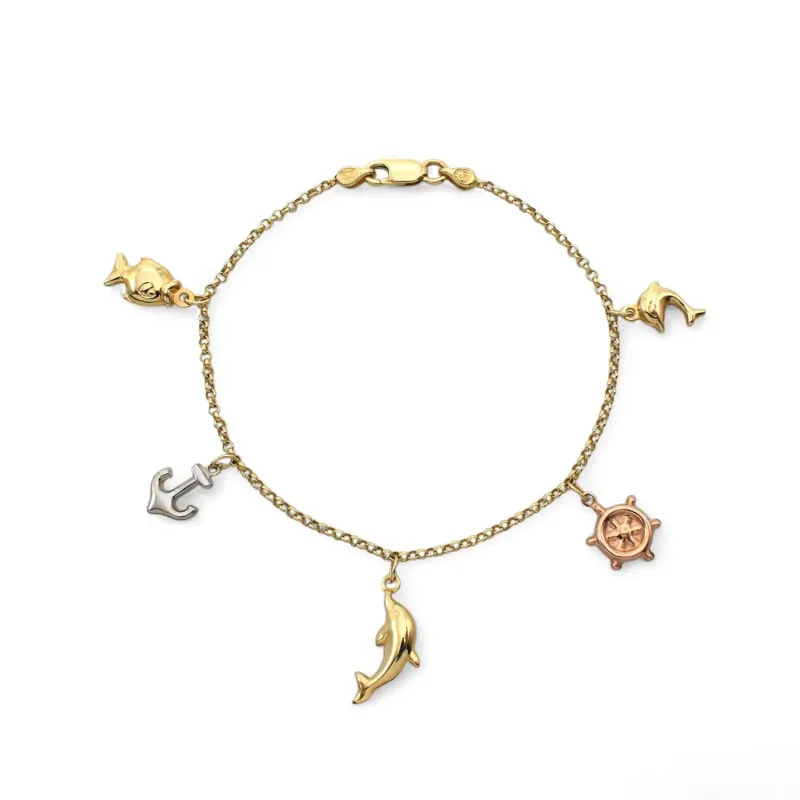 18kt Tricolor Gold Marine Anchor Rudder Dolphin Charm Bracelet