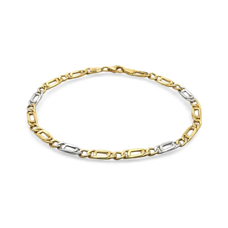 This classic 18kt Two-Tone Gold Bracelet is a versatile piece, ideal for both men and women. Its distinctive Figaro Link (or 3+1) is composed of a sequence of three small oval links followed by an elongated link, elegantly alternating polished yellow gold and polished white gold. This combination creates a dynamic and sophisticated visual effect. Measuring 20 cm and weighing 4 g, it is a solid and comfortable accessory, perfect for adding a touch of timeless elegance to the wrist.