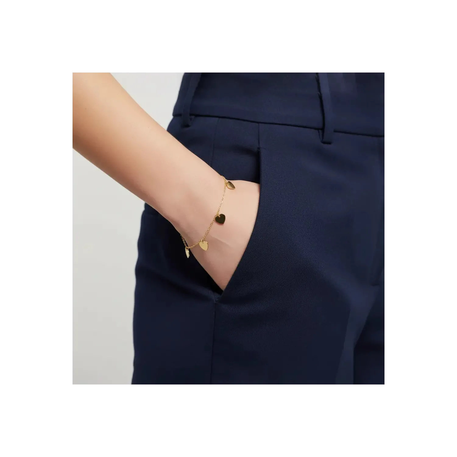 This delightful 18kt Yellow Gold Bracelet is a romantic and light piece, perfect for adding a touch of sweetness to the wrist. It is composed of a thin, polished yellow gold link chain, from which five graceful flat, polished hearts hang. The hearts, which gently swing with movement, add a playful and affectionate touch. Measuring 19 cm and weighing just 2 g, it is a discreet yet meaningful accessory, ideal as a gift to celebrate love or friendship, suitable for a versatile, everyday look.