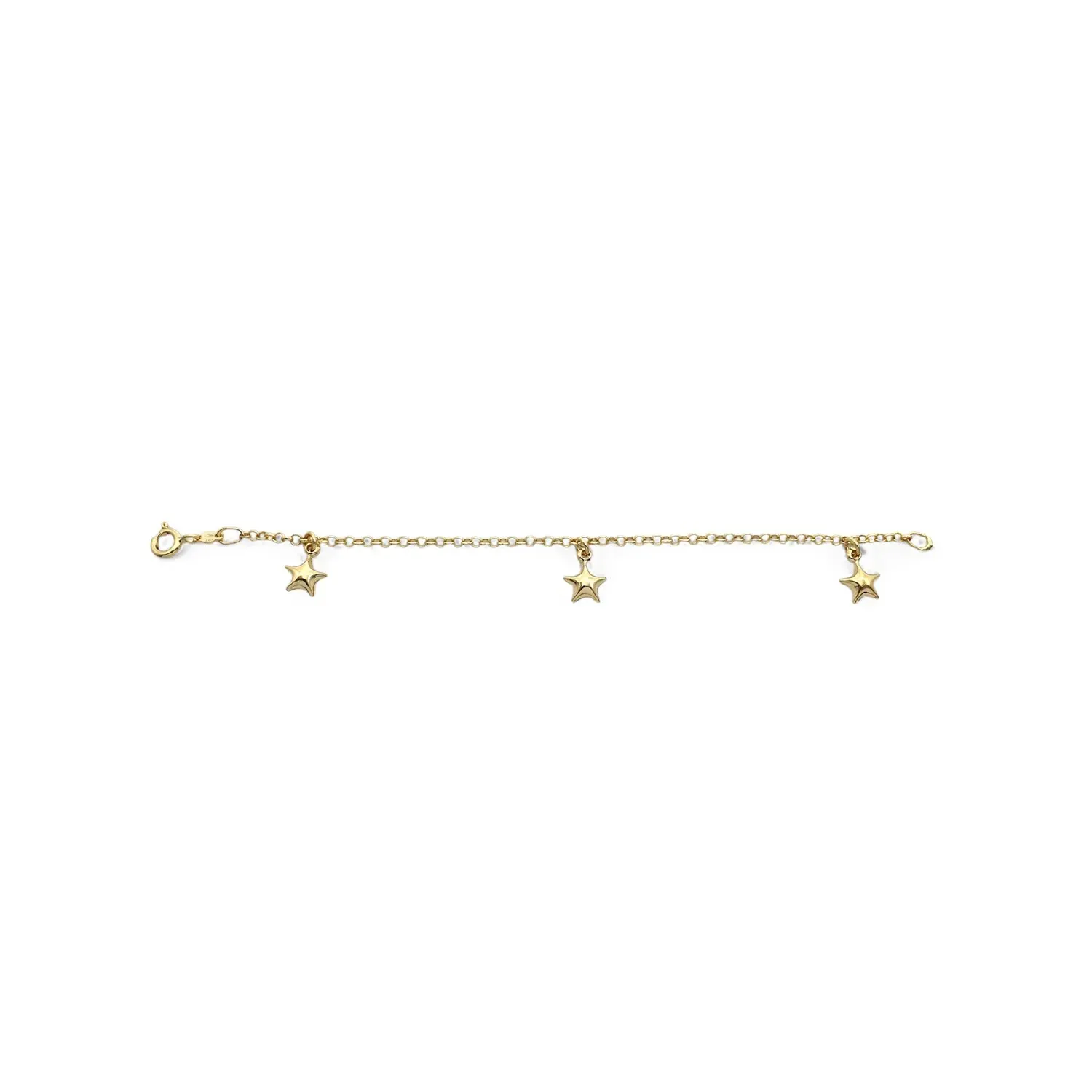 Delicate children's bracelet crafted from 18kt yellow gold. The design features a thin classic link chain embellished with three dangling star-shaped charms, evenly spaced along the length.