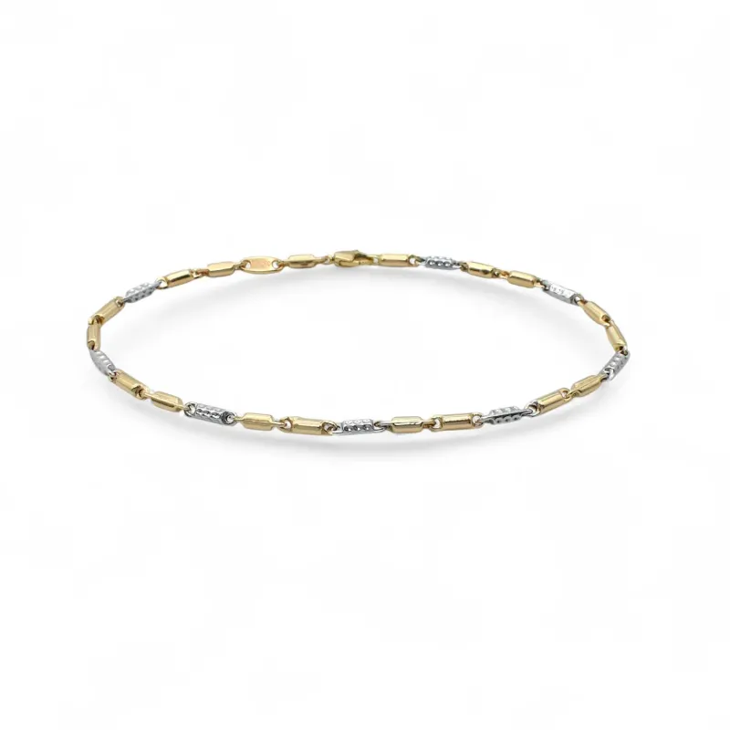 Two-tone bracelet crafted from 18kt gold, measuring 21 cm. The design stands out for its rhythmic alternation of yellow gold and white gold elements, creating a sharp and modern color contrast that enhances its shine.