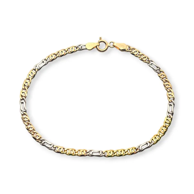 Bracelets Yellow and white gold bracelet with alternating links br0019 €310.00 Yellow and white gold bracelet with alternating links 18kt yellow gold. gr.2.2 Length 20 cm. Add to cart