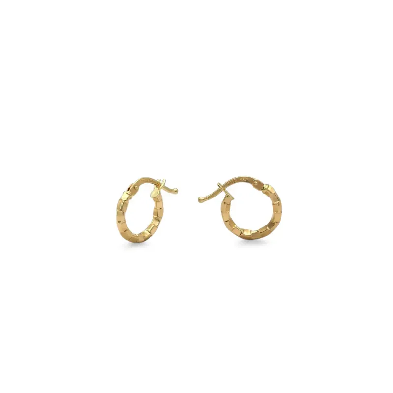 These delightful 18kt Yellow Gold Small Hoop Earrings are a timeless classic, perfect for those seeking a discreet yet luminous piece of jewelry. The hoop design is embellished with a diamond-cut finish that creates small, brilliant facets across the entire surface, capturing the light with every movement. With a diameter of 1.5 cm and a weight of 1.5 g, they are extremely light and comfortable to wear every day, ideal for illuminating the face with a touch of refined sparkle.