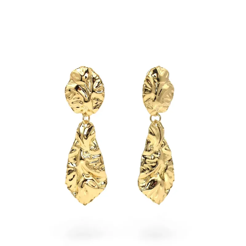 These extraordinary 18kt yellow gold drop earrings are a celebration of craftsmanship and cutting-edge style. Measuring 7 cm in length, they stand out for their exclusive frizz-effect finish: an irregular and vibrant texture that uniquely captures the light, creating warm, deep reflections across the entire surface of the precious metal.