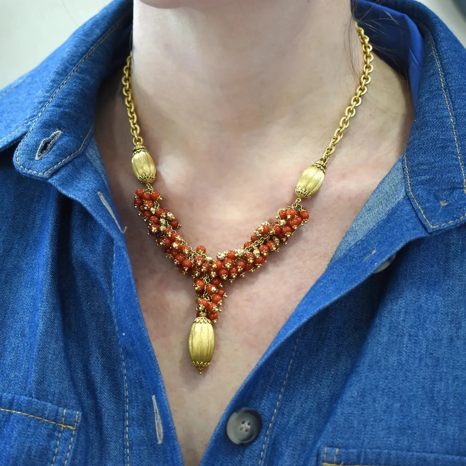 Y-Shape Choker Necklace in Satin Yellow Gold and Red Coral