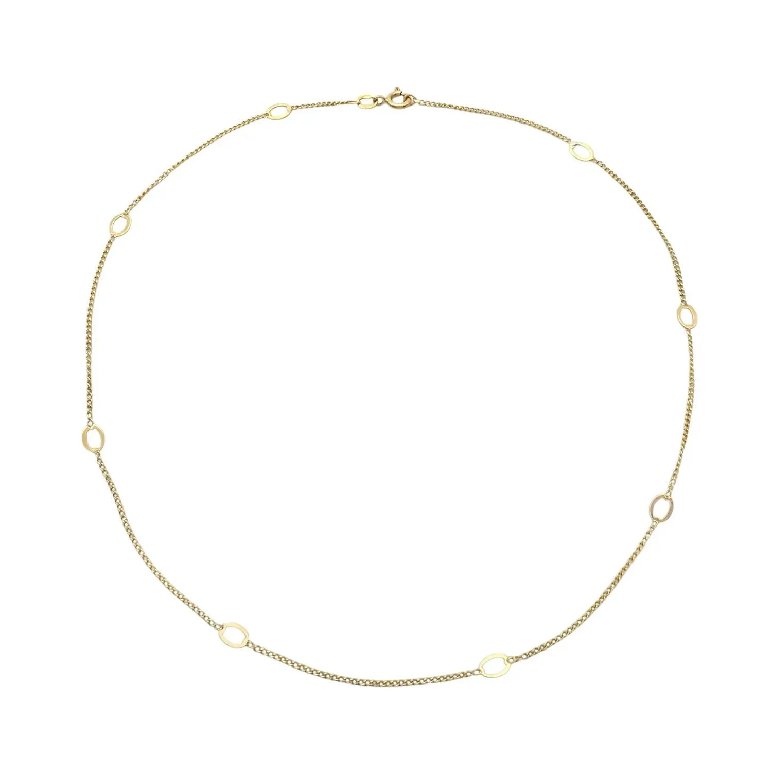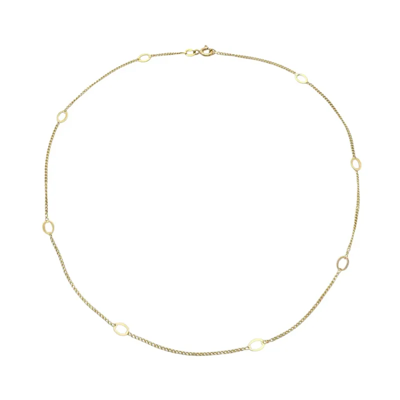 This modern 18kt Yellow Gold Necklace stands out for its contemporary design and brilliance. The structure is a combination of elegance and strength, composed of a thin Gourmette Link chain interspersed with empty, polished oval elements, arranged along its entire length. This dynamic, "station" design creates a play of light and reflections. Measuring 41 cm and weighing 3.3 g, it is a versatile piece, perfect for a minimalist, luminous look or as a refined base for layering with other necklaces.