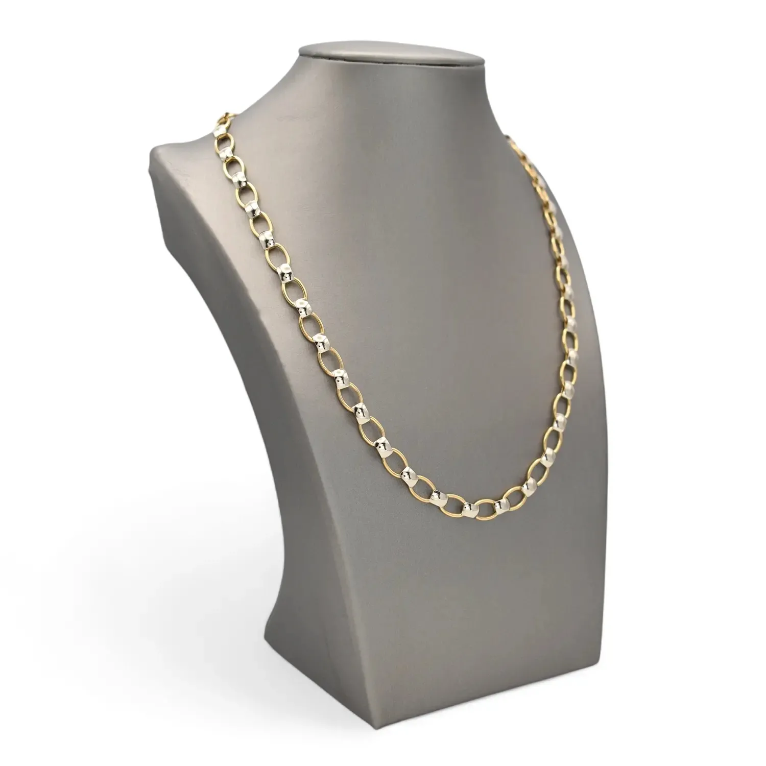Elegant necklace crafted from 18kt gold, featuring a contrasting color between yellow gold and white gold. The design alternates the two colors in a luminous and versatile link, ideal for easily combining with different styles and jewelry. Measuring 45 cm, the choker sits harmoniously on the décolleté, offering impeccable shine thanks to its fully polished finish.