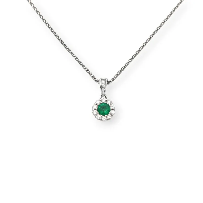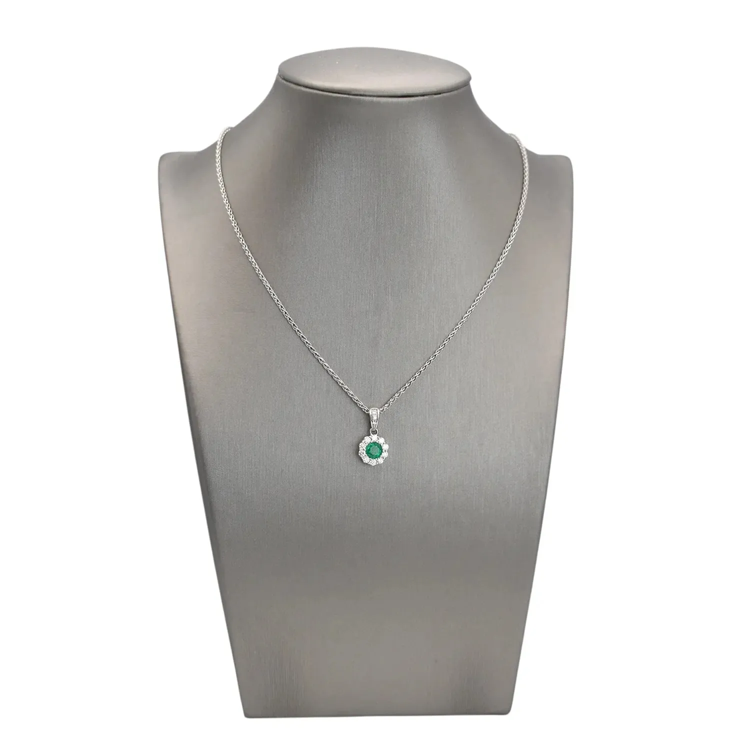 This magnificent 18kt white gold necklace is a jewel of rare beauty and prestige. At the center of the pendant shines a 0.50 ct round-cut emerald, characterized by a vivid, deep green hue. The gem is enhanced by a luxurious frame of 0.39 ct brilliant-cut diamonds, creating an aura of extraordinary light.