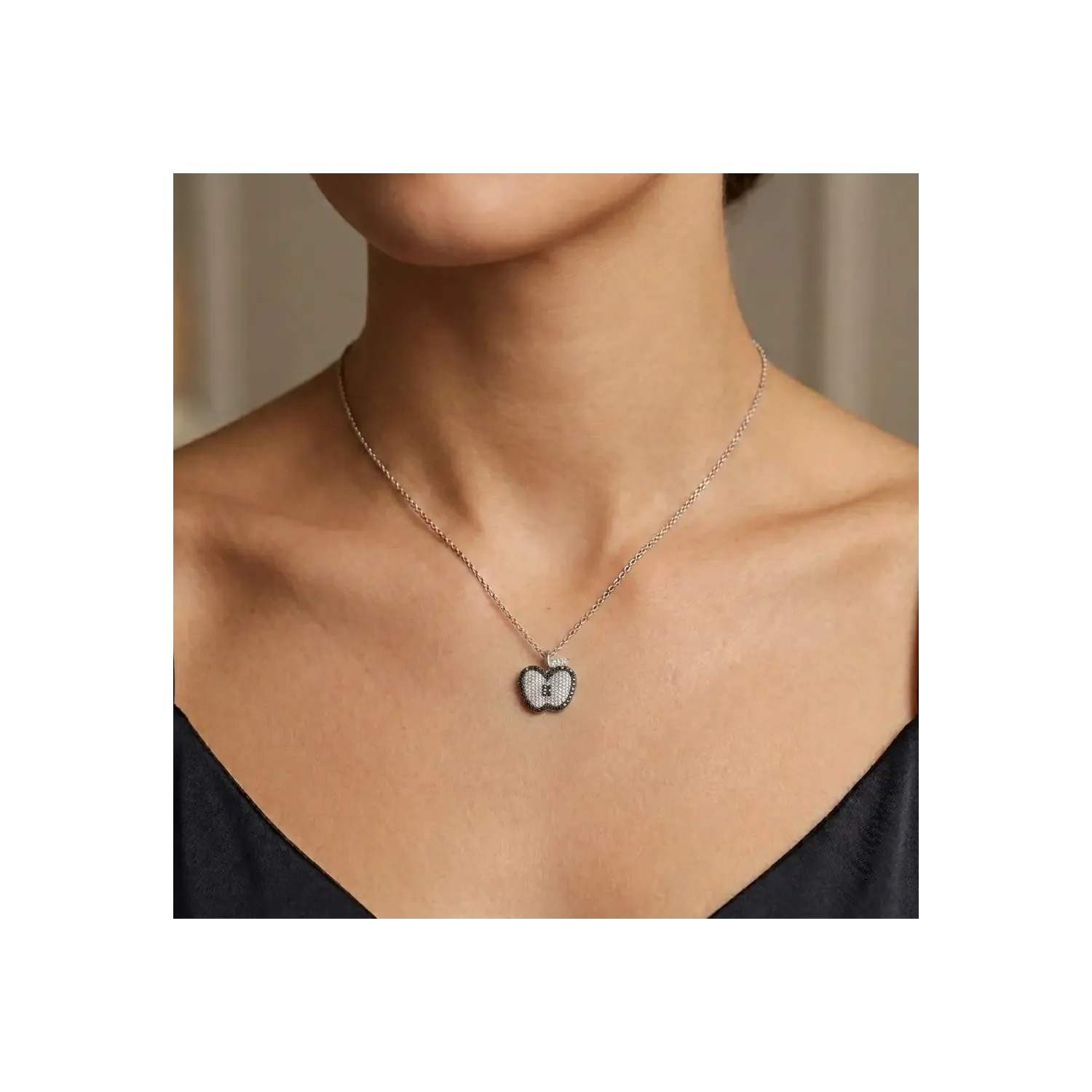 This original 18kt white gold necklace features a sophisticated apple-shaped pendant, an iconic design that combines classic symbolism and contemporary style. The jewel plays on a sophisticated color contrast: one section is illuminated by white brilliant-cut diamonds (0.27 ct), while the remaining section is defined by a pavé of black diamonds (0.20 ct).