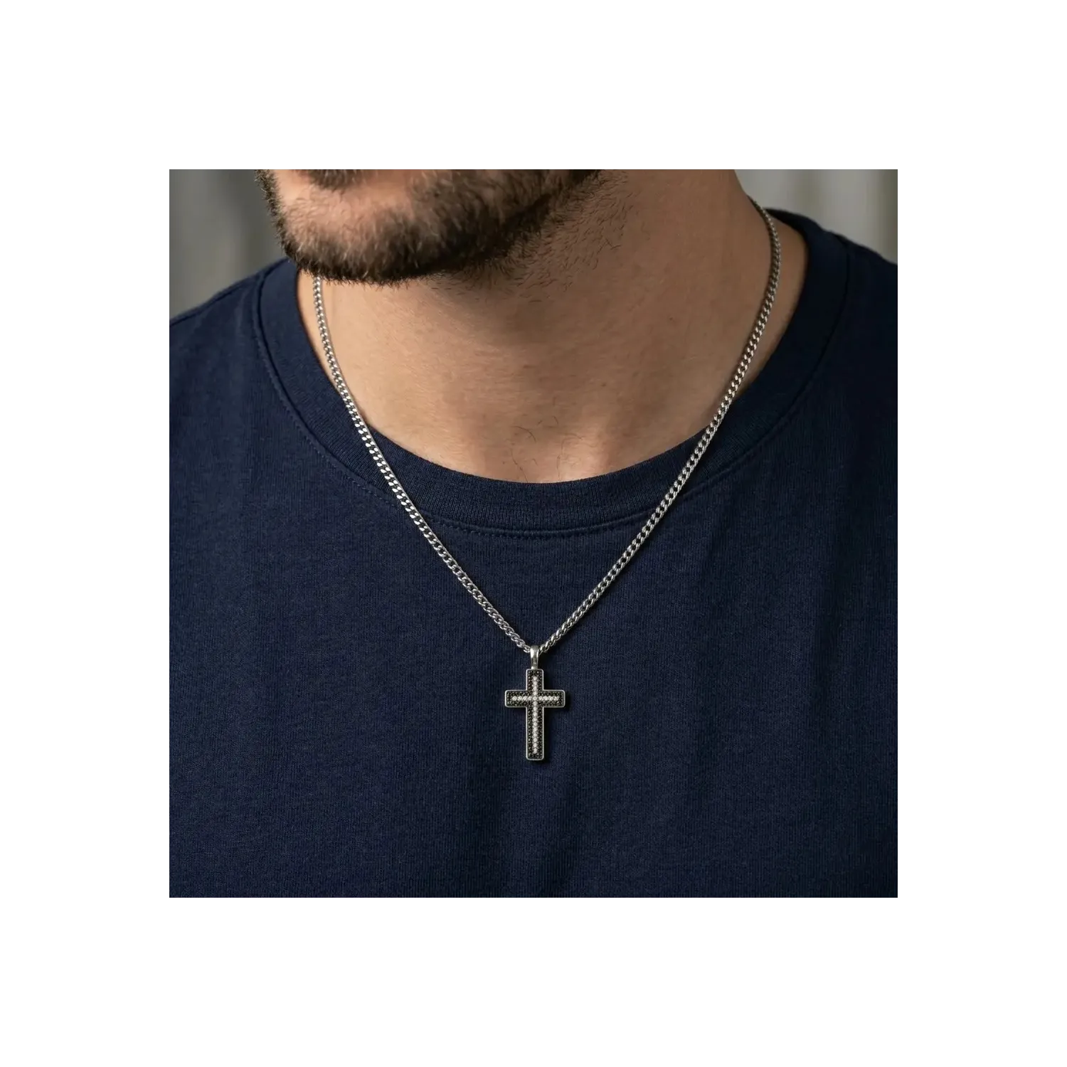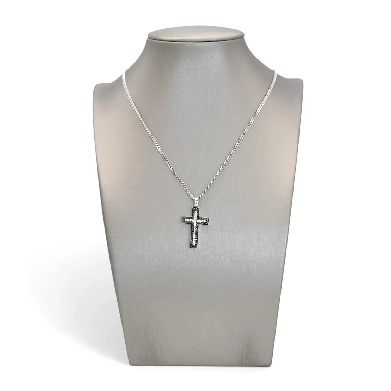 This imposing 18kt white gold necklace is a jewel with a bold and contemporary design, created for a unisex audience seeking an accessory with a strong personality. The cross-shaped pendant stands out for its sophisticated color contrast: a selection of brilliant-cut white diamonds (0.14 ct) is framed by a deep pavé of black diamonds (0.36 ct).
