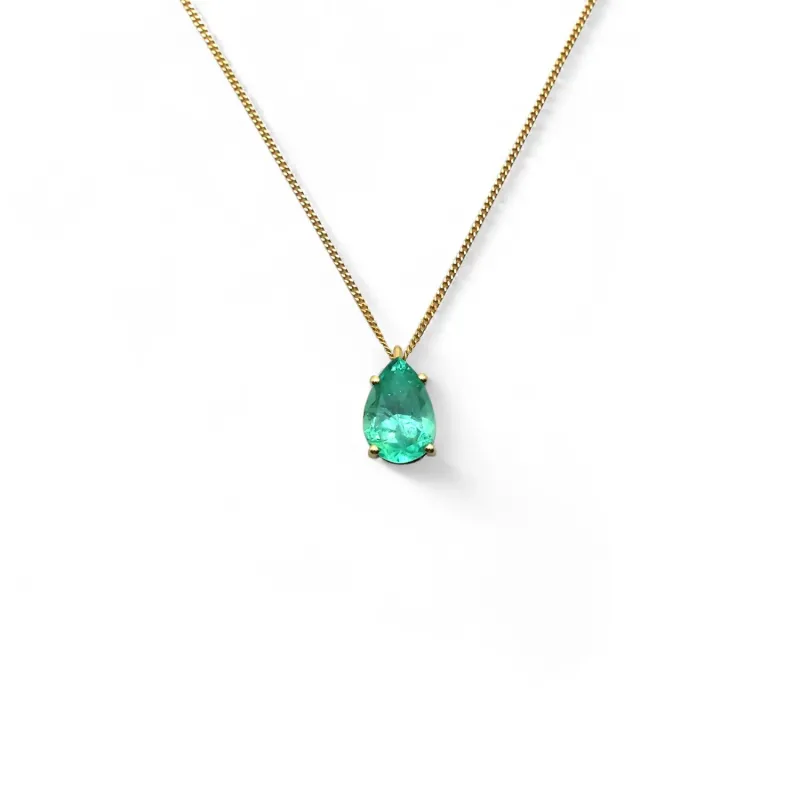 This elegant 18kt yellow gold pendant celebrates the natural beauty of the emerald. At its center, a pear-cut gem weighing a generous 1.85 ct is set in a refined wire setting, which follows its shape without overpowering it, allowing the light to reveal the stone's intense chromatic depth.