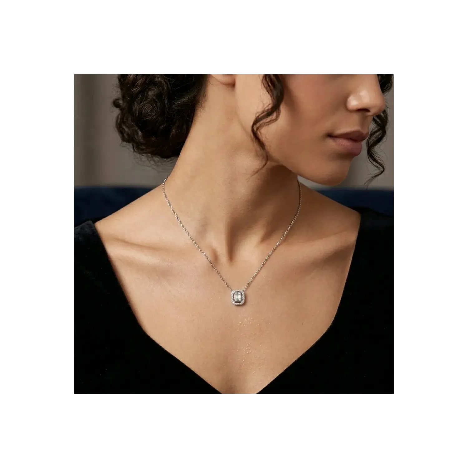 This refined 18kt white gold choker is a celebration of geometric design and sophisticated light. The pendant, with its distinctive octagonal shape, features a heart composed of baguette-cut diamonds, set with pinpoint precision to create a seamless mirrored surface. This central composition is enclosed in a splendid frame of brilliant-cut diamonds, for a total carat weight of 0.19 ct.