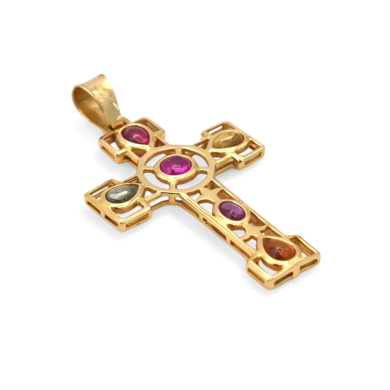 Discover the Stella Maris cross pendant in fine 18-karat yellow gold. A unique jewel, embellished with luminous cabochon-cut duralite stones, chosen for their vibrant colors. Perfect for a sophisticated look or as a precious gift. Crafted with master craftsmanship, this pendant combines tradition and contemporary design. Add a touch of light to your style or celebrate a special moment. A symbol of faith and timeless beauty, signed Stella Maris.