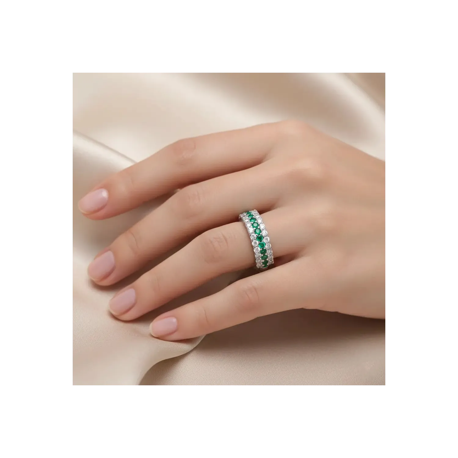 18kt White Gold Band Ring with Three Rows of White and Green Zirconia