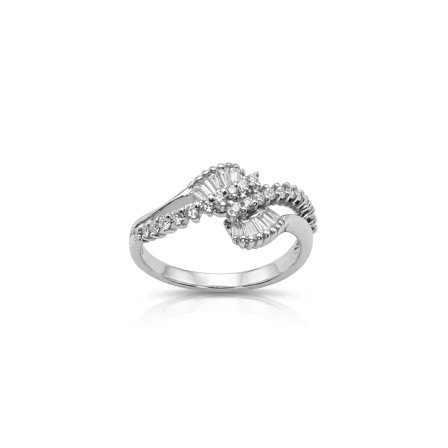 This enchanting 18kt white gold ring is a triumph of geometry and brilliance. The design is distinguished by a sophisticated central interlacing composition, where baguette-cut diamonds are arranged radially to create two elegant fans of light, expertly finished with edges of brilliant-cut diamonds (0.43 ct total).