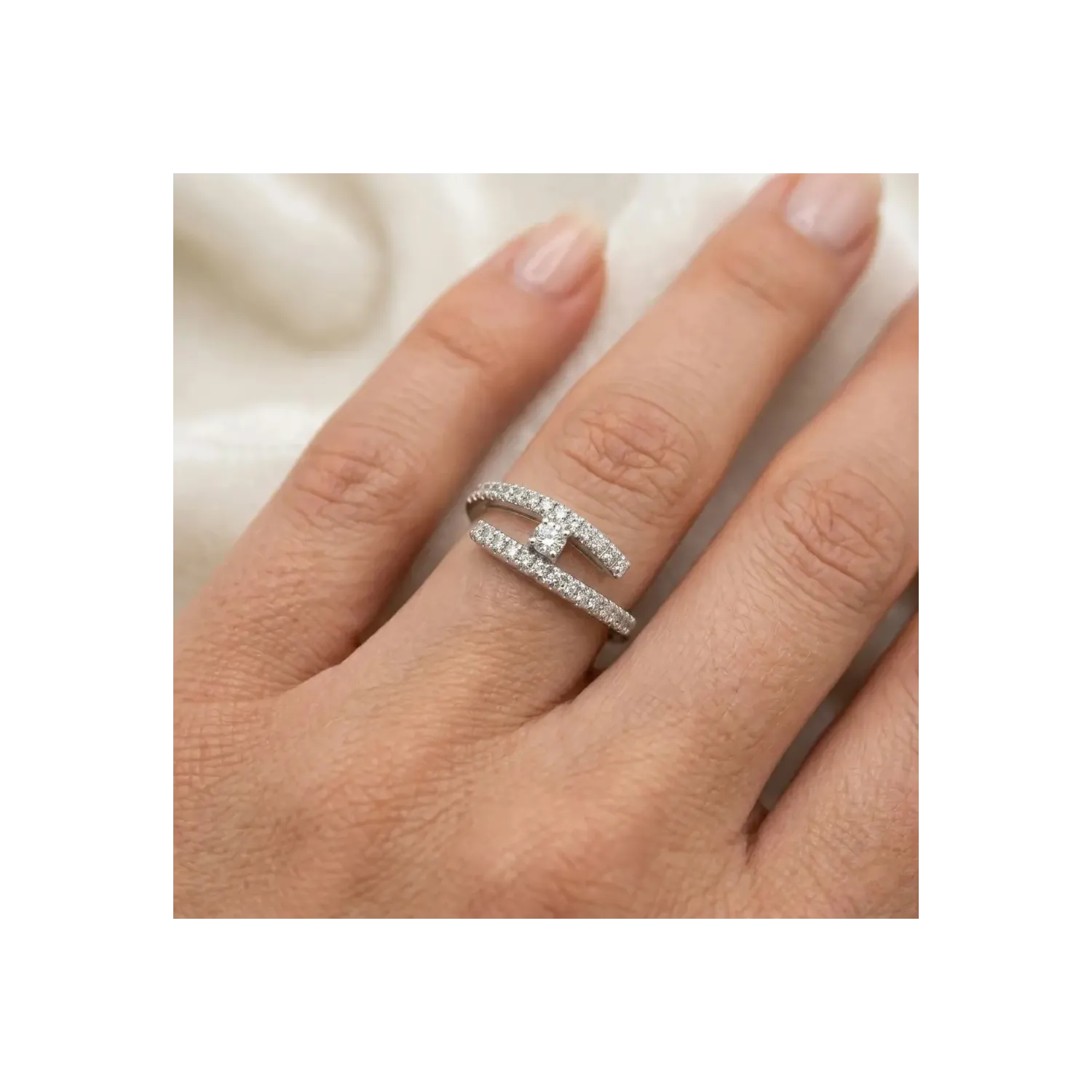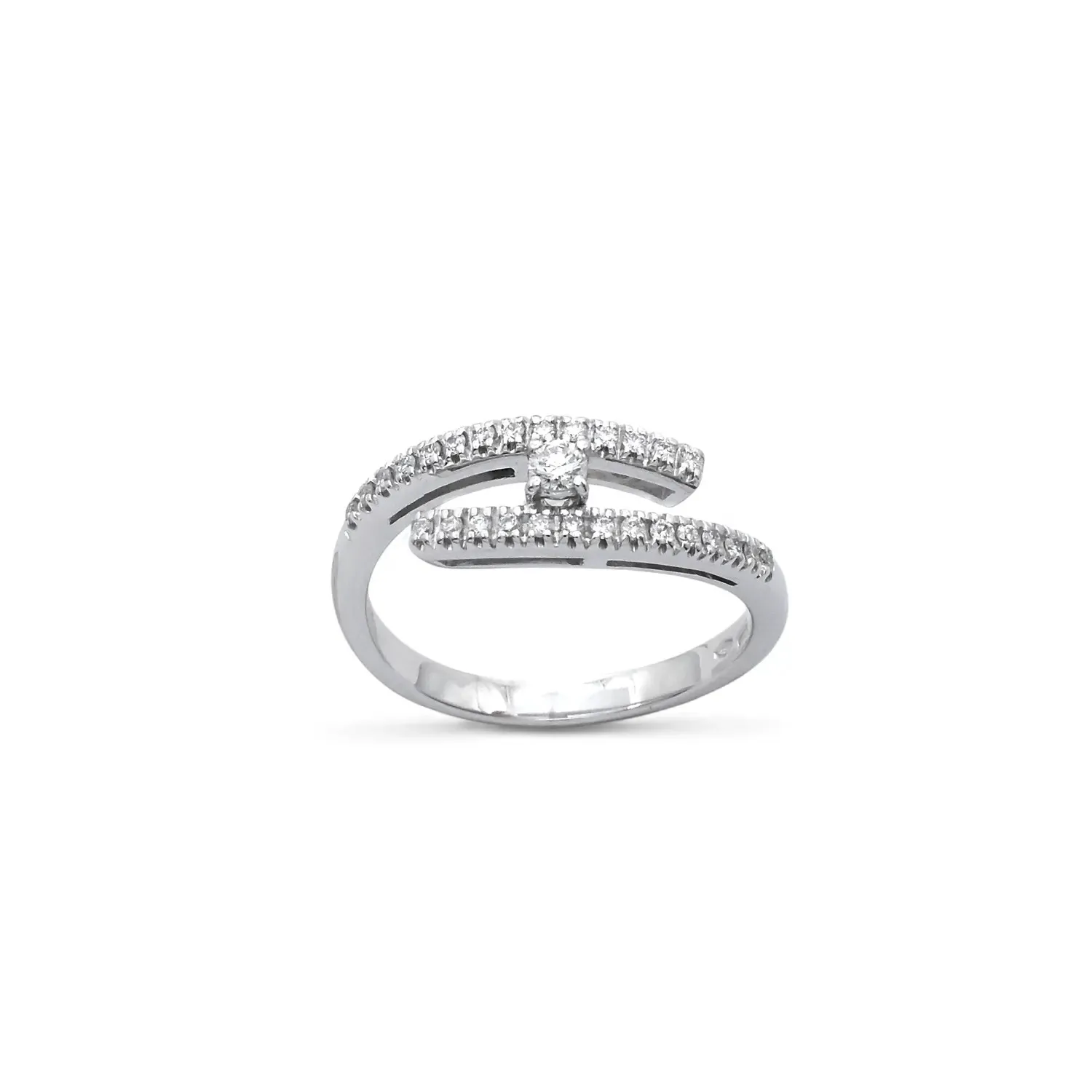 This exclusive 18kt white gold ring embodies a modern vision of goldsmith elegance. The design features a parallel, asymmetrical double band, entirely embellished with pavé-set brilliant-cut diamonds (0.30 ct total). At the center, suspended between the architectural lines of the setting, a 0.10 ct central diamond sparkles, capturing the light from every angle.