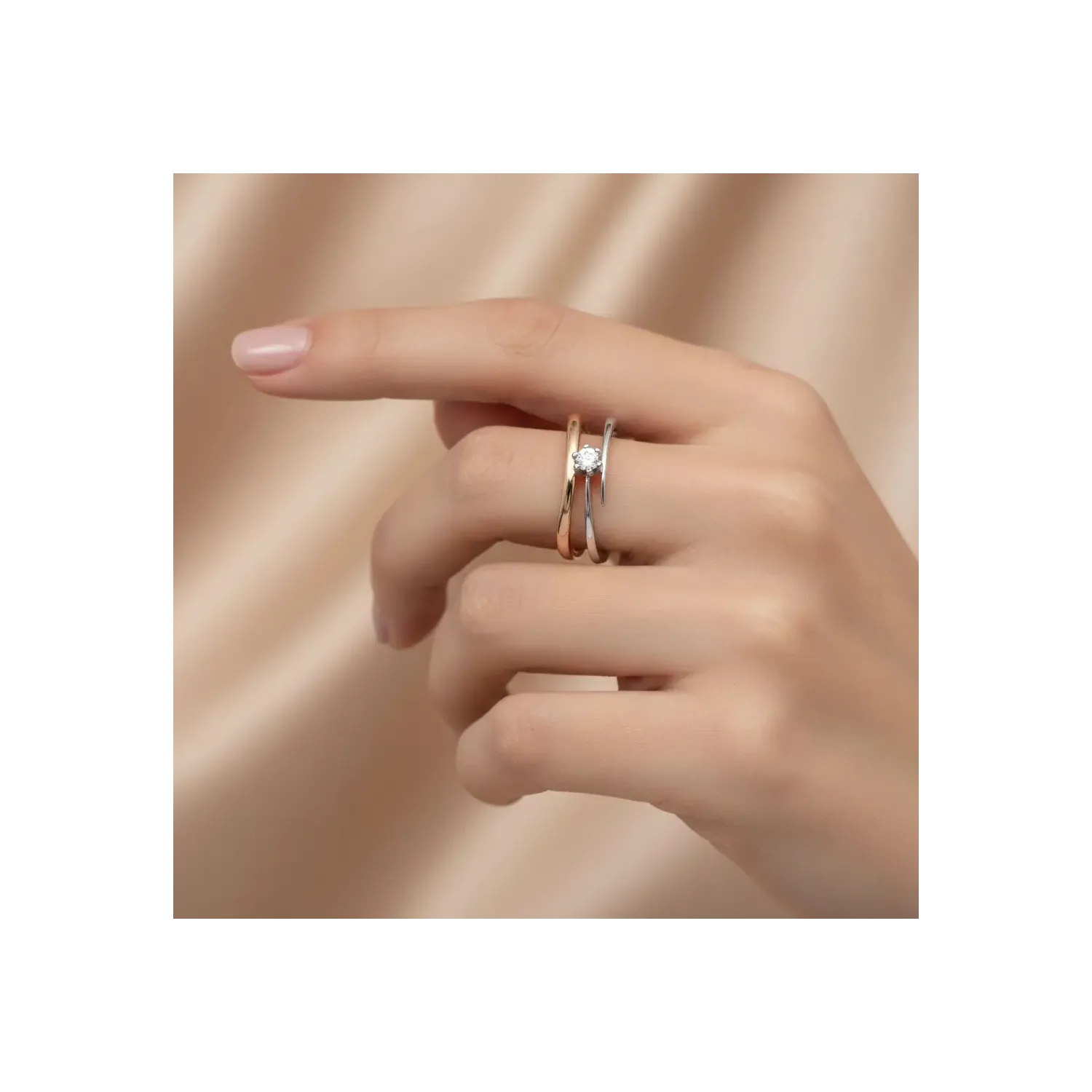 This exclusive solitaire ring blends the warmth of rose gold with the timeless elegance of 18kt white gold. The centerpiece is a 0.16 ct brilliant-cut diamond, set in a classic 6-prong setting that elevates the stone, allowing light to shine through from every angle, maximizing its brilliance.
