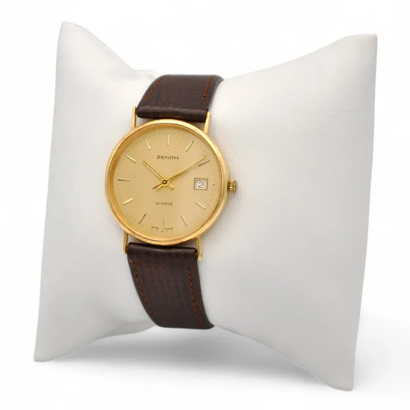 Elegant vintage Zenith wristwatch in yellow gold, a true jewel of Swiss watchmaking. The champagne dial, with stick indexes and a date window, is in good condition. The yellow gold case, with clean lines, gives the watch a timeless elegance. The quartz movement guarantees precision and reliability. A brown leather strap completes the classic aesthetic of this timepiece. A unique collector's piece, perfect for those looking for a watch of the highest quality.