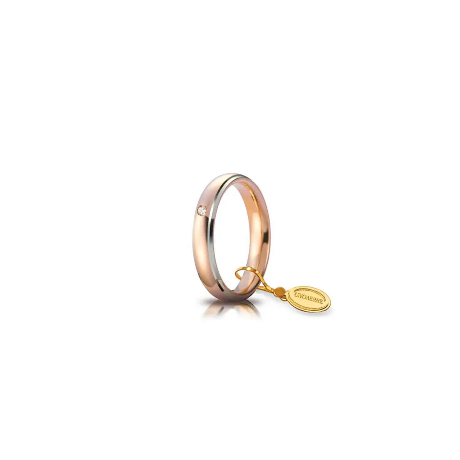 "Comfortable" wedding ring in 750 rose gold with rhodium-plated edges and brilliant-cut diamond ct. 0.03. Gr from 5.70 to 6.70 - Mm 4.00 The elegance of rose gold and the refined decoration of the rhodium-plated edges make this ring a unique one.