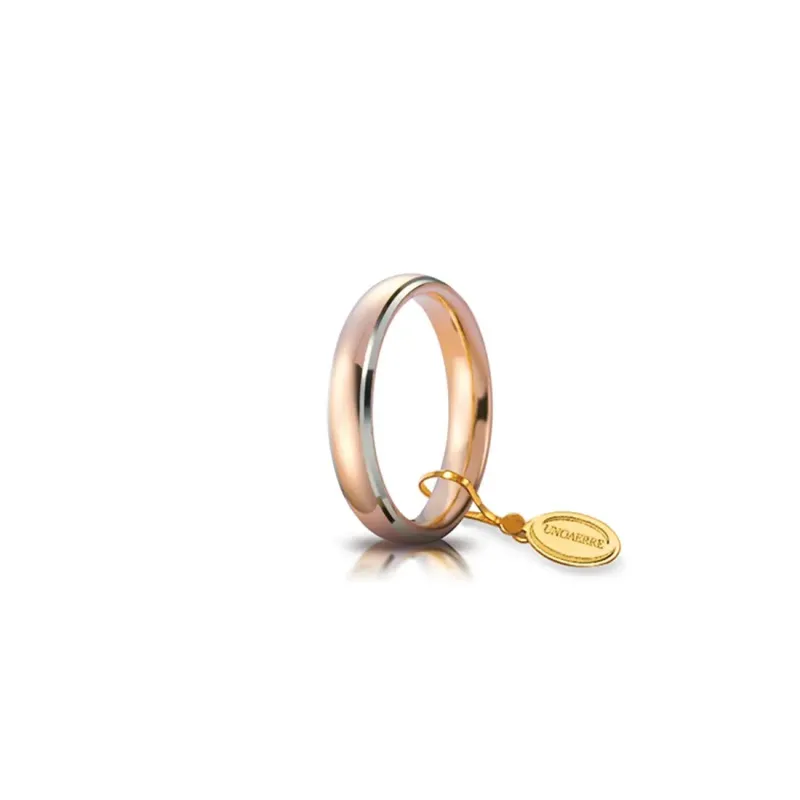 "Comfortable" wedding ring in 750 rose gold with rhodium-plated edges and brilliant-cut diamond ct. 0.03. Gr from 5.70 to 6.70 - Mm 4.00 The elegance of rose gold and the refined decoration of the rhodium-plated edges make this ring a unique one.