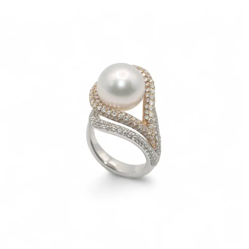 Anillo en oro blanco y rosa con pavé de diamantes y perla central de Australia