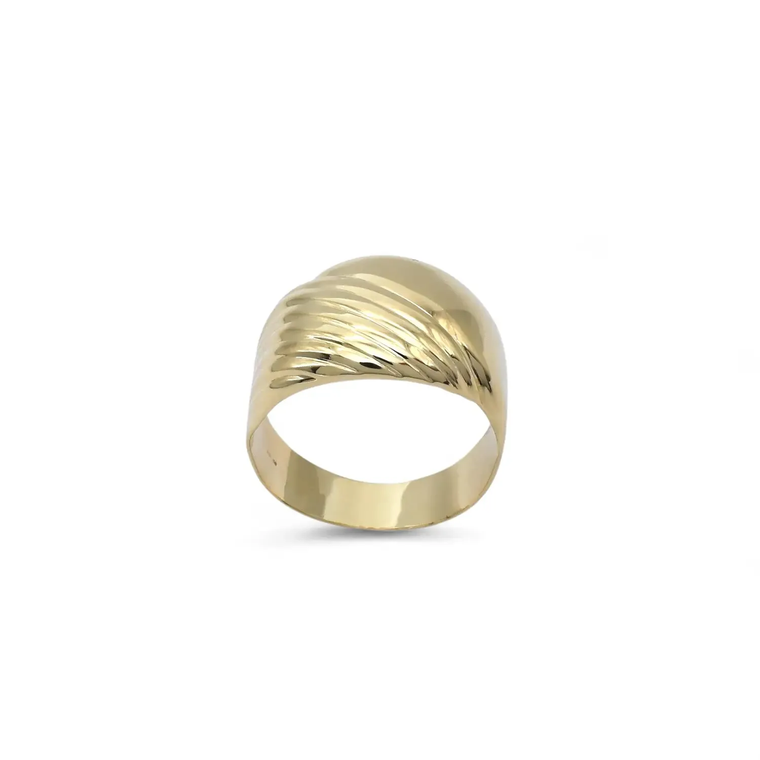 Anillo de oro amarillo de 18 kt con acabado pulido. La parte superior presenta un doble perfil: una sección presenta un relieve ondulado, mientras que la otra mitad presenta una superficie lisa y lineal. Este juego de formas crea un contraste asimétrico moderno y elegante. La estructura de banda inclinada garantiza un uso cómodo y versátil.