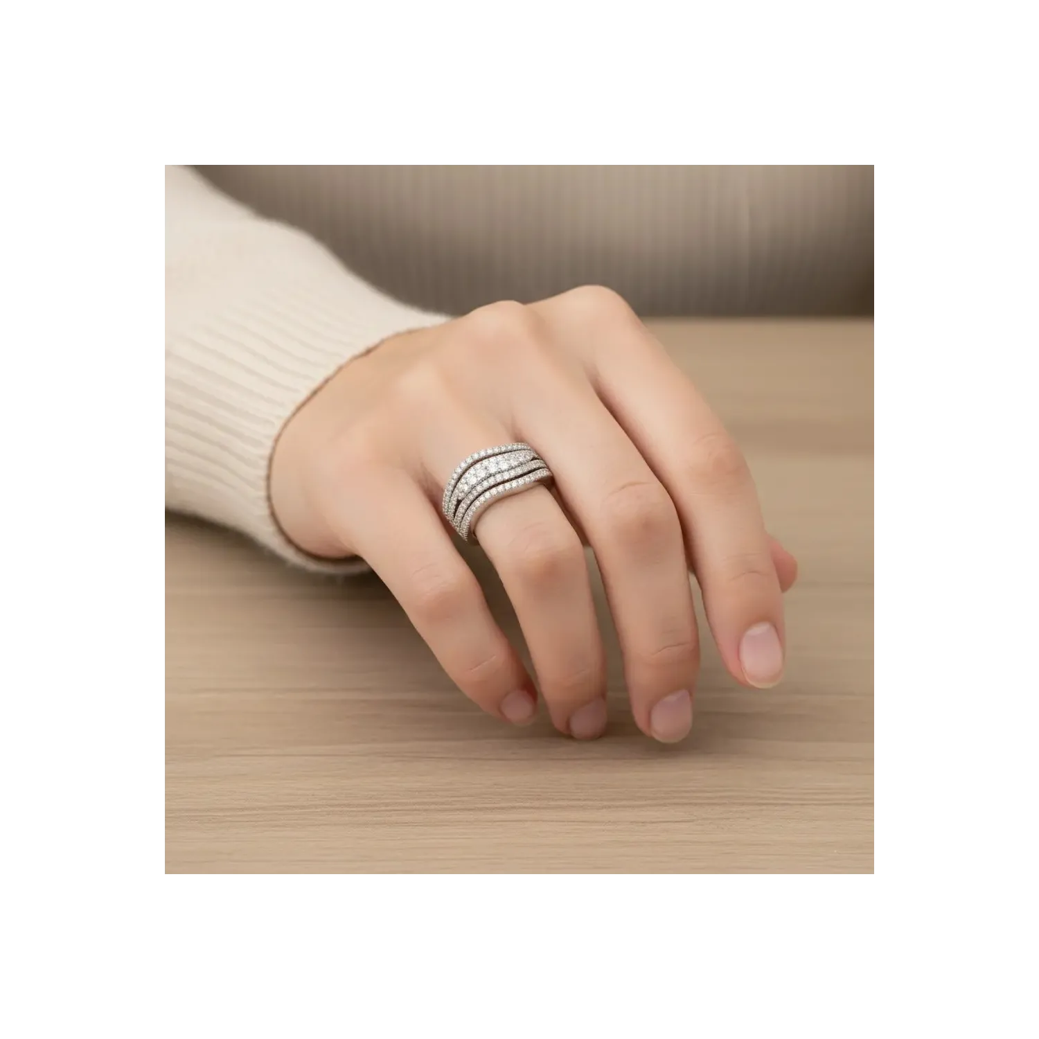 Este suntuoso anillo de oro blanco de 18 quilates es una auténtica obra maestra de diseño y luz. El engaste, con un peso de 13 gramos, presenta una banda articulada que culmina en una sección central adornada con diamantes de talla brillante, con un peso total de 0,89 quilates. La característica distintiva de esta joya reside en la disposición de las piedras: los diamantes están engastados mediante una hábil técnica de graduación, con brillantes centrales de mayor tamaño que se inclinan armoniosamente hacia los lados. La arquitectura de esta orfebrería crea un efecto de profundidad y un brillo multidimensional. Una pieza de alta joyería italiana diseñada para quienes buscan una joya con gran carácter y prestigio.