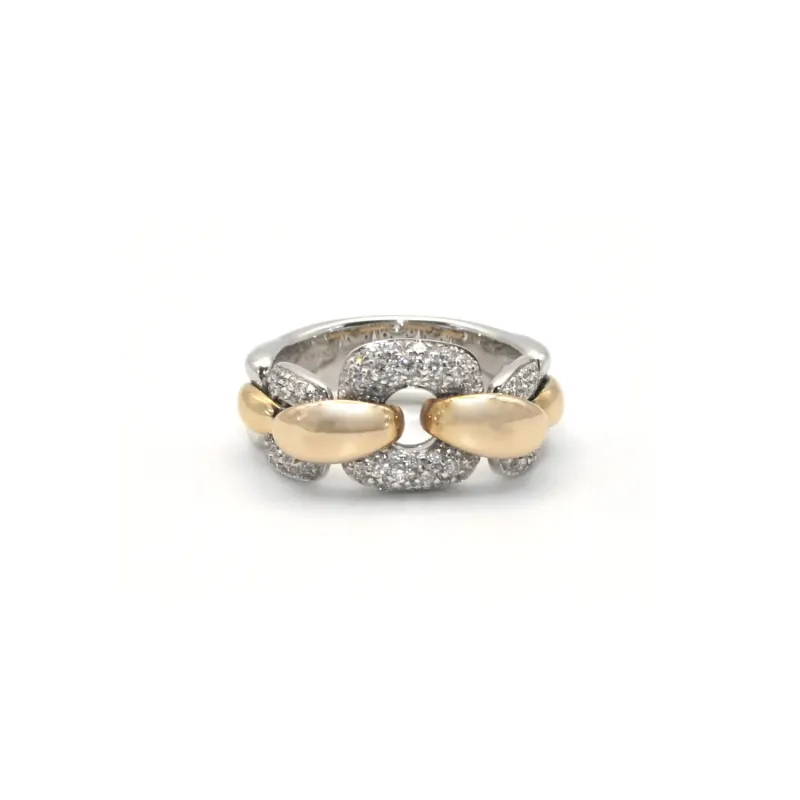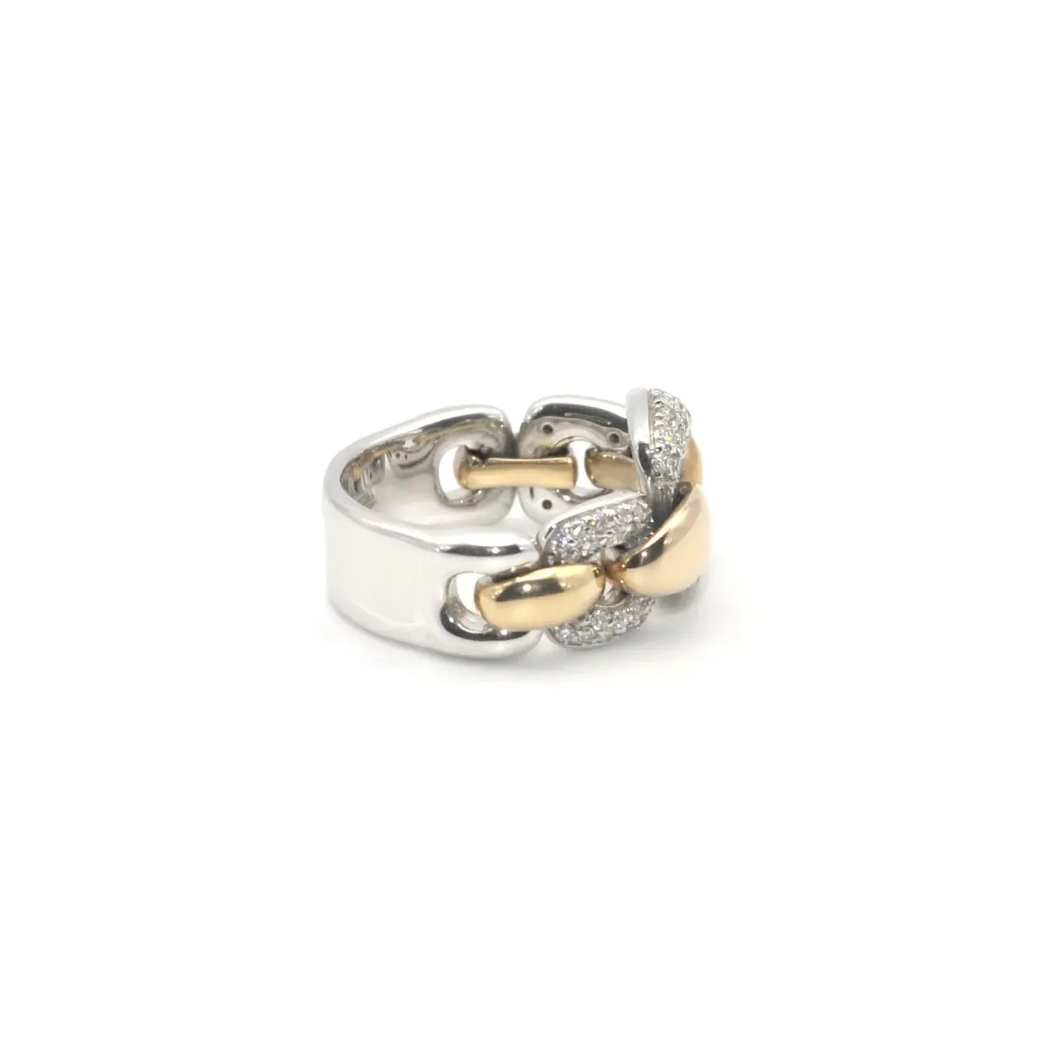 Anillo caracterizado por un diseño contemporáneo y una elaboración de alta calidad. La combinación de oro blanco y rosa, junto con el pavé de diamantes, lo convierte en un accesorio brillante y fascinante, perfecto para quienes aman las joyas únicas y con fuerte carácter.