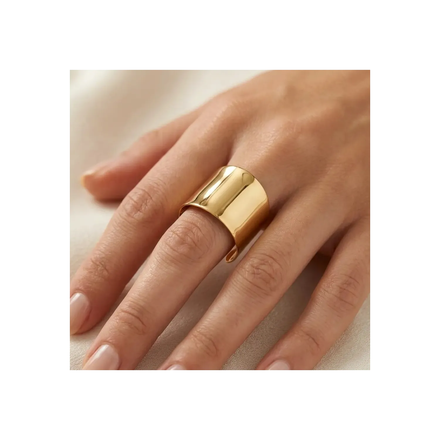 Una declaración de estilo audaz y luminosa: este anillo de banda alta en oro amarillo de 18 quilates está diseñado para quienes aman las joyas que destacan. Con una superficie pulida a espejo, el anillo captura cada reflejo de luz, envolviendo el dedo con una elegancia moderna y escultural.