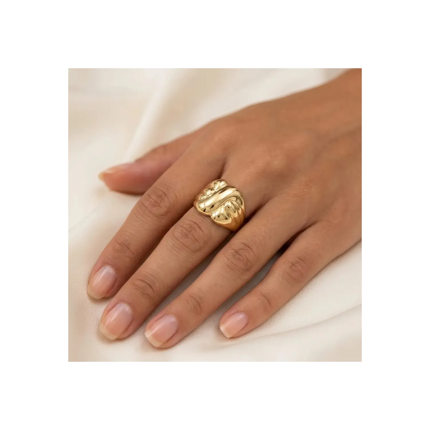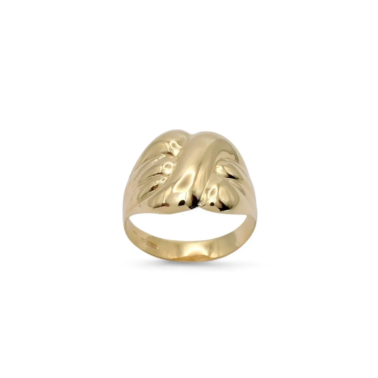 La elegancia volumétrica cobra forma en este espléndido anillo de banda abovedada en oro amarillo de 18 quilates. El diseño se distingue por un refinado trabajo acanalado (moleteado) que crea un dinámico juego de curvas y reflejos, otorgando a la joya una apariencia escultural y tridimensional con un impactante efecto visual.